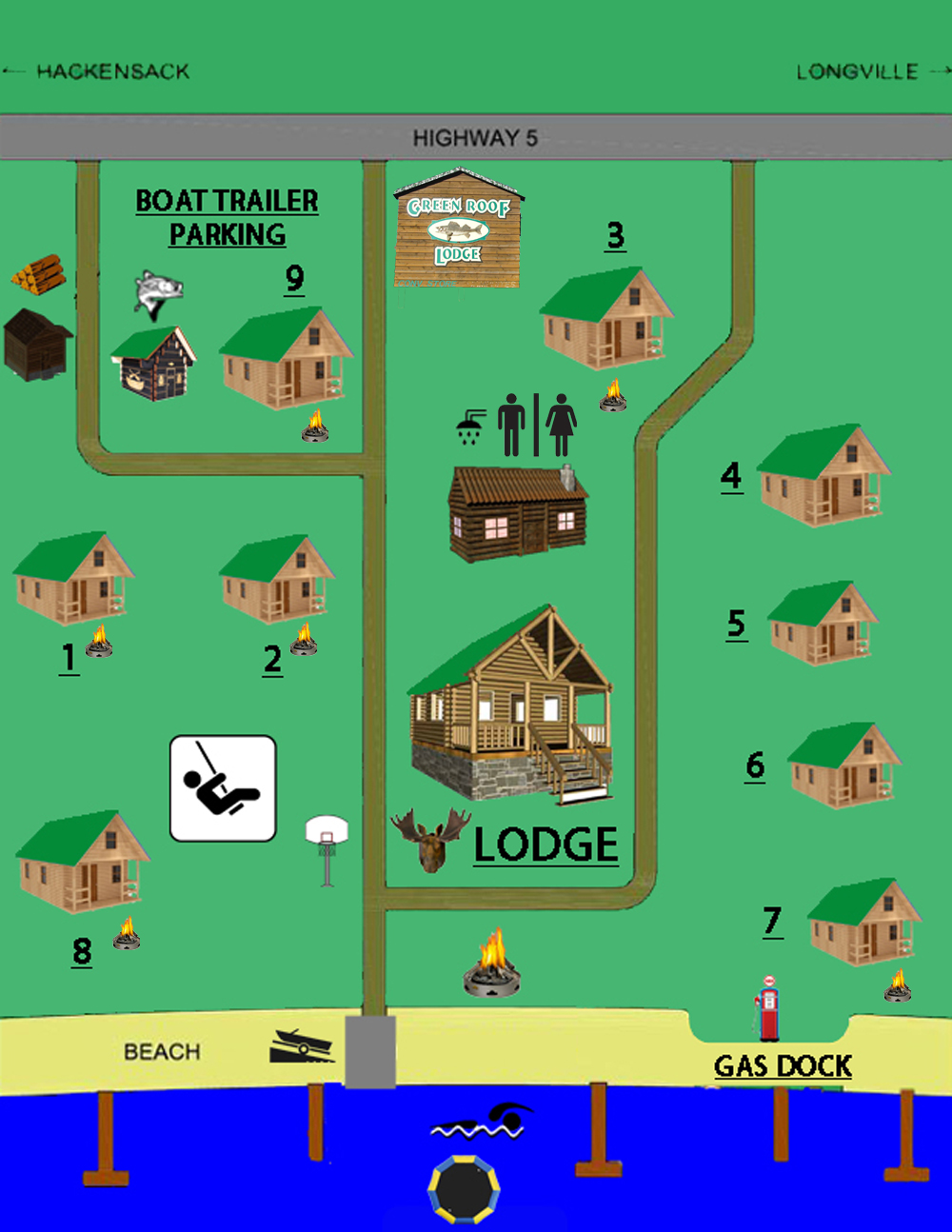 Green Roof Lodge is a welcoming resort located on Woman Lake, offering easy access from highway 5. The owners are known for their kindness and accommodating service, making guests feel at home. The cabins are clean, well-equipped, and perfect for families, with ample space for boats and plenty of water activities for kids. Guests can enjoy free use of various water toys and indulge in delicious desserts, including famous strawberry rhubarb pie and hard ice cream from the lodge. Many families return year after year, enjoying the beautiful beach and friendly atmosphere. Whether for a weekend getaway or a summer retreat, Green Roof Lodge is a favorite destination for all.