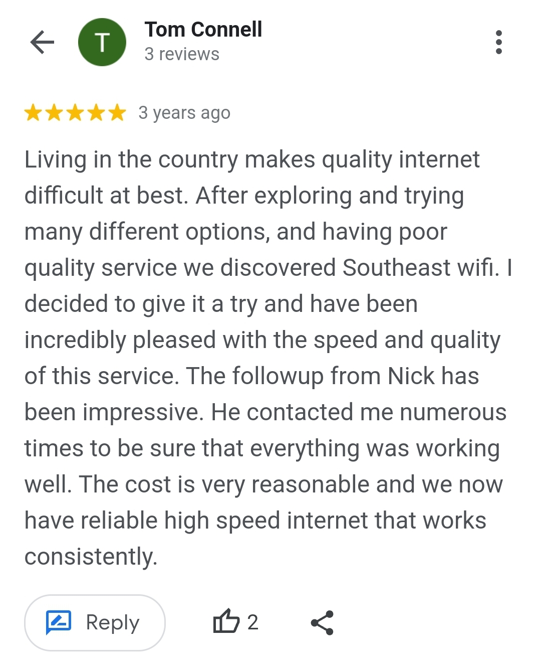 Southeast MN WIFI provides fiber internet service, particularly in rural communities where options were previously very poor or limited to satellite. Customers report spectacular results, with internet speed upgrades by a factor of ten or fifteen, including 1Gbps symmetric service. The service itself is consistently strong, reliable, and top-notch. The company is noted for being incredibly responsive, with impressive and quick response times to questions, issues, or needed assistance. They are very transparent, super easy to work with, and provide efficient service. Installations and transitions from previous companies are smooth, with crews described as efficient, courteous, and informative. The team is incredibly friendly, helpful, and genuinely cares about customers, offering a personal touch and professional service. They maintain clear communication, sending emails about service outages and providing a backup until a fix is complete. Support is reliably just a call away, offering peace of mind. Customers highlight going above and beyond, such as resolving issues free of charge. Overall, experiences are extremely satisfying over multiple years, with many highly recommending the company for its great customer service and unbeatable service.
