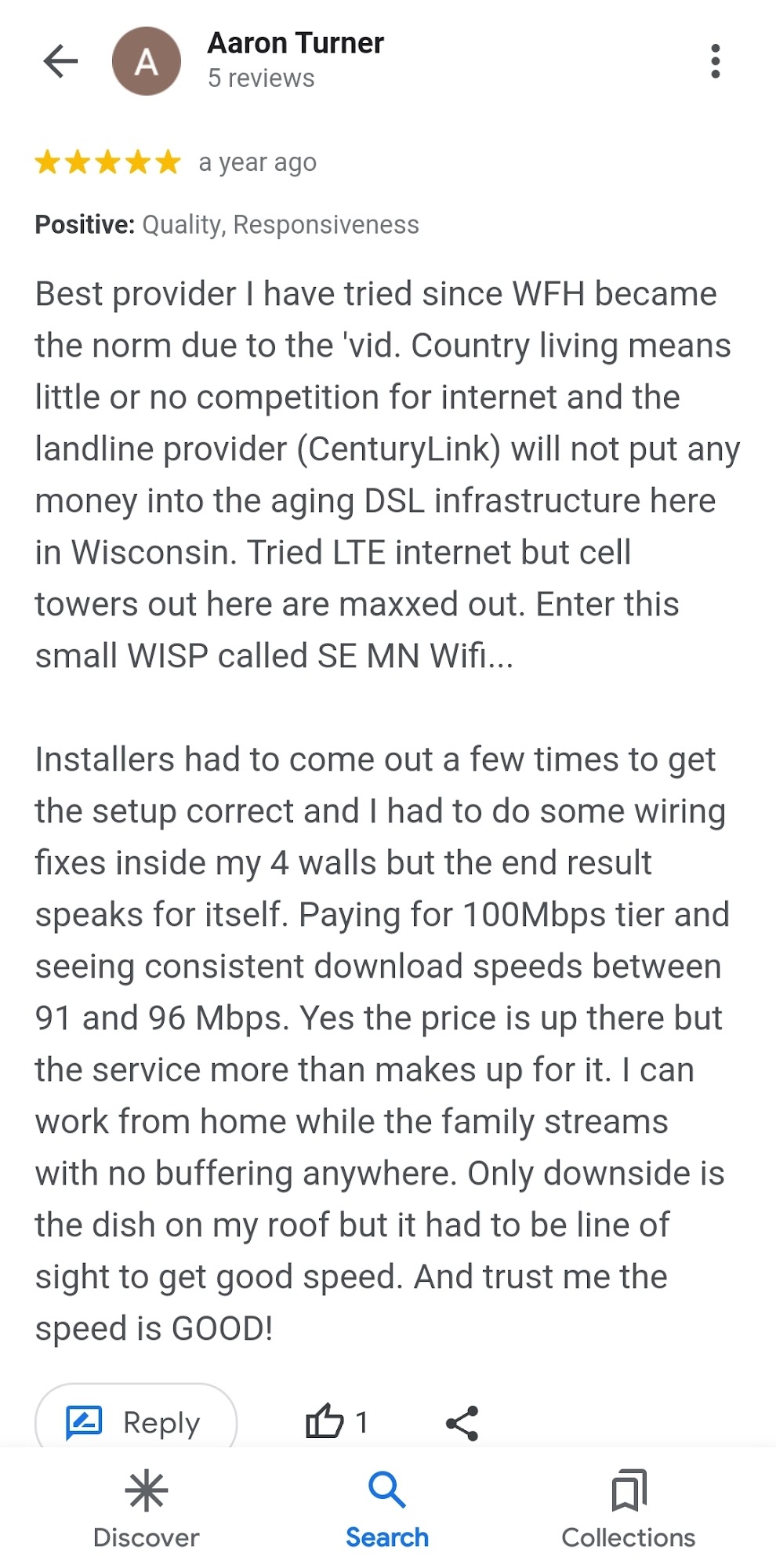 Southeast MN Wi-Fi brought us an alternative that allowed us to upgrade our Wi-Fi speed by a factor of 15. After 3-4 years of service, we are extremely satisfied with their service and responsiveness.