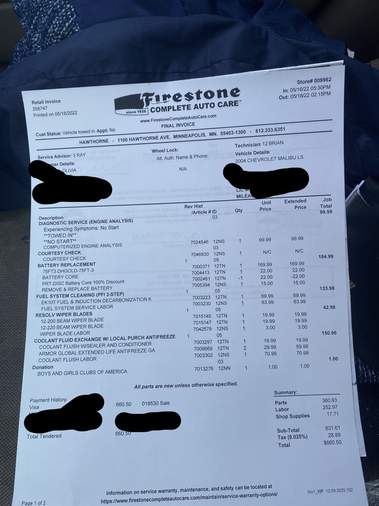 Firestone Complete Auto Care at 1100 Hawthorne Ave in Minneapolis is a one-stop shop for vehicle needs, from standard maintenance to tires and repairs. The staff are friendly, professional, and accommodating, willing to speak with customers about their vehicles. The location is great, with a wide open, clean showroom offering a view of the city. Customers report great experiences for services like tire patch-ups, replacements, brake inspections, oil changes, and engine repairs. The team is helpful in explaining work done and does not try to upsell on unneeded services. They provide updates via email and explain everything on the invoice clearly. Services include swapping seasonal tires, installing customer-purchased tires, and offering options like lifetime alignment adjustments. The process is described as pleasant, easy, and timely, with supportive assistance that helps coordinate services and promotions. Customers feel taken care of and informed, appreciating the reliable and affordable auto care tailored to their needs.