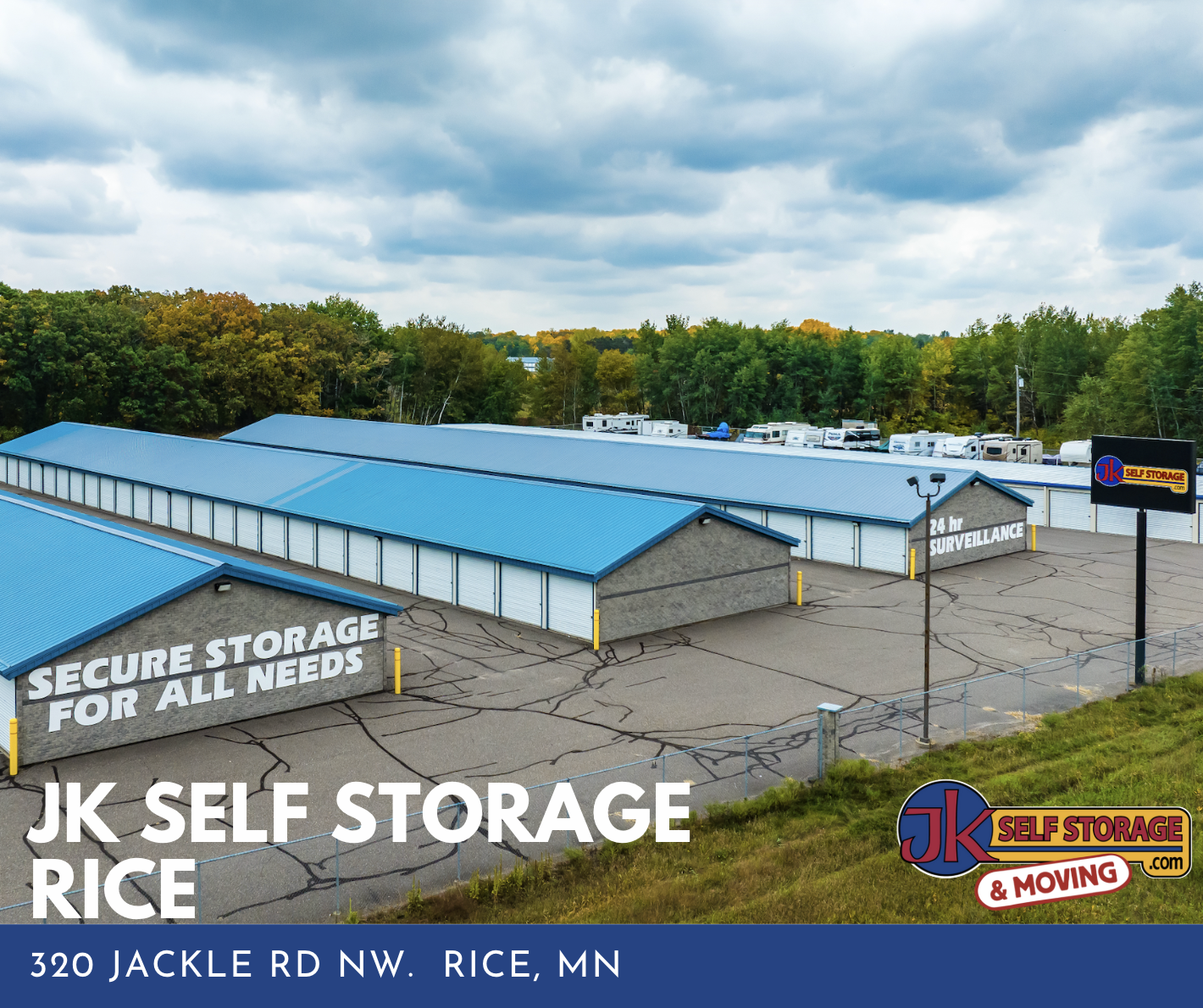 JK Self Storage - Rice is your Central MN storage solution! Conveniently located at 320 Jackle Road Northwest, Rice, MN. Start storing today! Large & small storage units and outdoor parking to fit all your storage needs. We’re here help with your residential, commercial, RV, boat storage & more. "Storage made Simple"