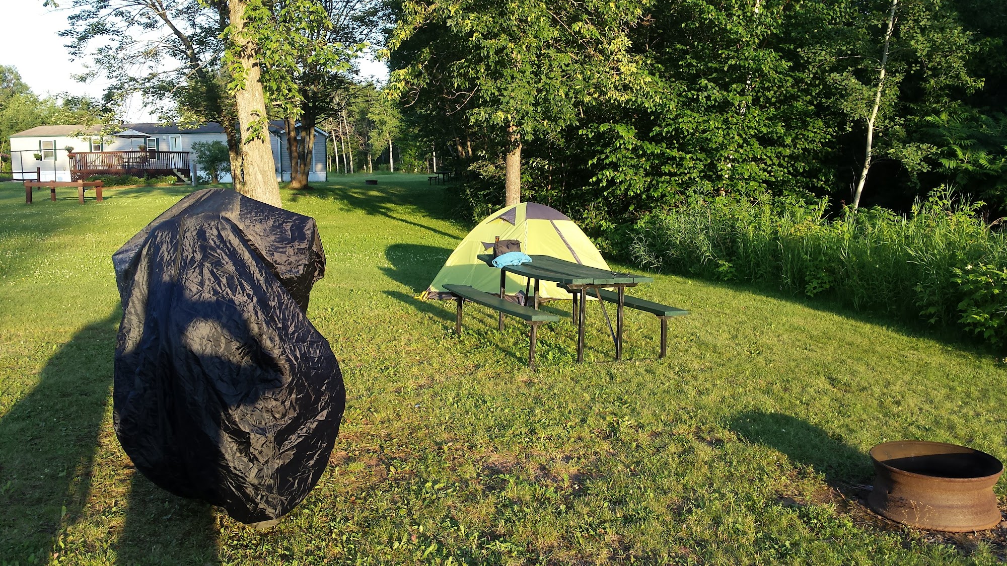Didn't stay here, only pulled in to dump $10! No one in the office & the doorbell battery was dead, thankfully someone at the house close by seen us. Asked about a nights stay $40 full hookup! A bit expensive if you ask me. Did notice a Bar and grill across the road! The grounds looked well kept.
