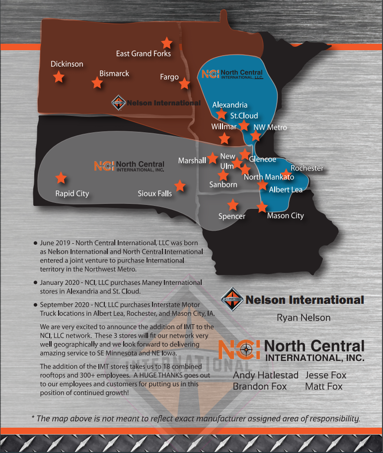 Nelson International Trucks is an International commercial truck dealership in Willmar, MN. Nelson International Trucks is a subsidiary of Nelson Leasing Inc., which as a whole covers North Dakota and Minnesota. As a commercial truck dealership, Nelson Leasing Inc. dba Nelson International Trucks offers truck sales, truck rental, truck leasing, truck financing, all makes truck parts, truck repair service, body shop, trailer shop, and wrecker services. Nelson International trucks and it's subcontractor dealers through North Dakota and Minnesota offers the best heavy duty commercial truck/semi tractor and trailer service in the area.