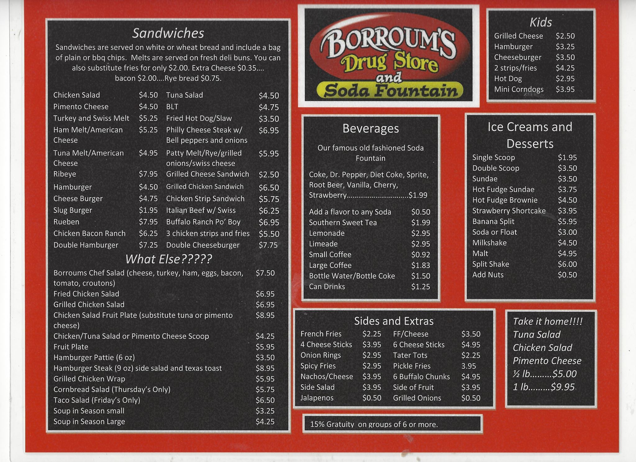 Borroums Drug Store is a charming old-time soda fountain and diner that offers a nostalgic dining experience. The historic building adds to its unique charm, making it a great place to visit. The menu features classic American favorites like burgers, patty melts, and fries, with many reviewers praising the food for being delicious and well-cooked. The burgers are often highlighted as some of the best, with perfectly cooked patties and customizable toppings, while the patty melts are noted for their flavorful ingredients and nostalgic appeal. The crinkle-cut fries are crispy outside and soft inside, though some feel they could be improved. Visitors enjoy the classic fountain drinks, especially the fountain Coke and strawberry sodas, which add to the authentic experience. The staff is consistently described as friendly, attentive, and accommodating, making the service pleasant despite the busy atmosphere. The ambience is highly praised for its historic and genuine feel, often evoking fond memories and a sense of comfort. Many recommend trying the milkshakes, Blue Bell ice cream, and other fountain treats. Overall, Borroums Drug Store is a popular and highly recommended spot, well worth a visit for its great food, friendly service, and nostalgic atmosphere.