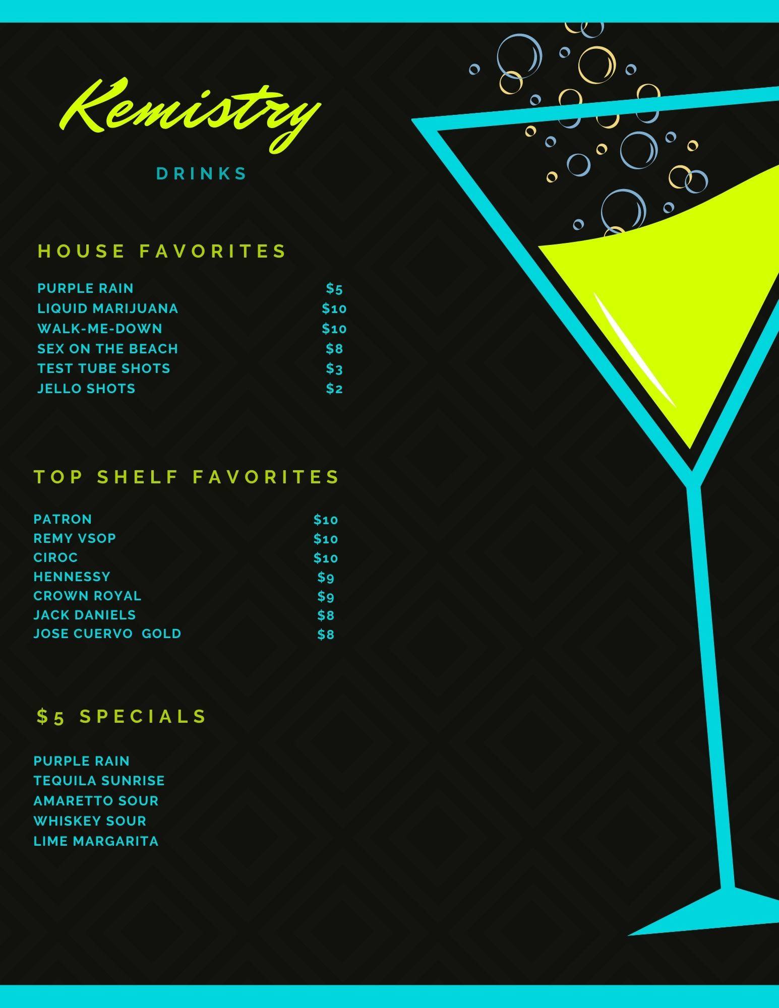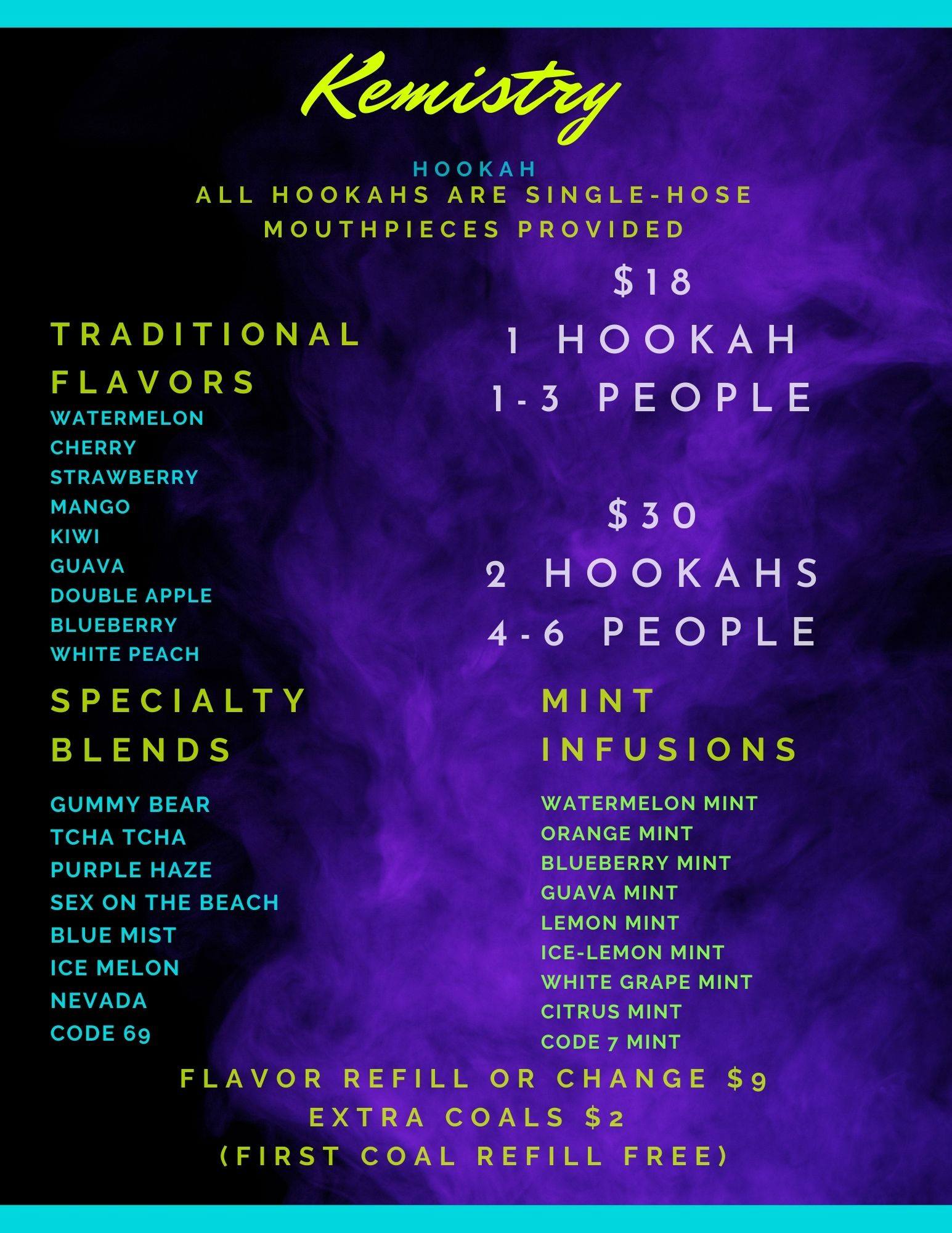 Kemistry Hookah Lounge offers a vibrant atmosphere with live music, great food, and friendly staff. Guests enjoy the laid-back vibe, featuring pool tables and a patio for relaxation. While the drinks and food receive positive feedback, some customers have expressed disappointment with the hookah experience, particularly regarding the use of plastic hoses. There have also been concerns about the staff's handling of hookah during restroom breaks, although management has addressed issues by offering complimentary hookah on occasion. The menu includes popular items like SW egg rolls, while some dishes, like the wings, have received mixed reviews. Overall, Kemistry Hookah Lounge is appreciated for its ambiance and hospitality, making it a spot worth visiting for a fun night out.