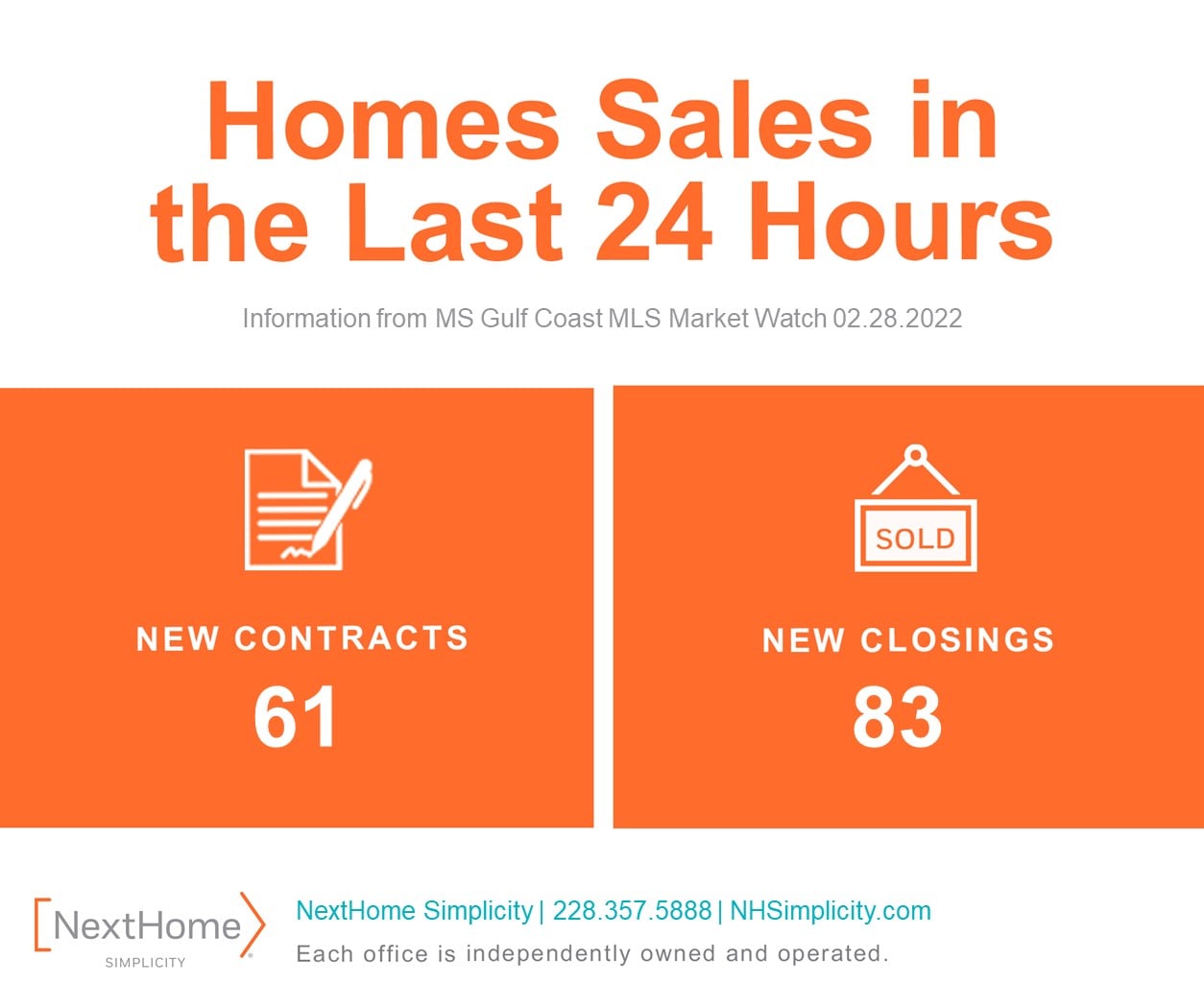 NextHome Simplicity - Real Estate Made Simple. There are over 700 NextHome offices across the country and NextHome Simplicity was the 10th highest selling NextHome office in the country in 2022. When developing NextHome Simplicity, our mission was to make the selling and buying process as simple as possible for the consumer. We do this by hiring and training only the best Realtors in the business, providing the most advanced real estate tools and technology, having strict minimum listing standards, and unlike other MS Gulf Coast brokerages, we formally train our brand new Realtors and provide them with an experienced mentor to ensure all our clients have the best experience possible.