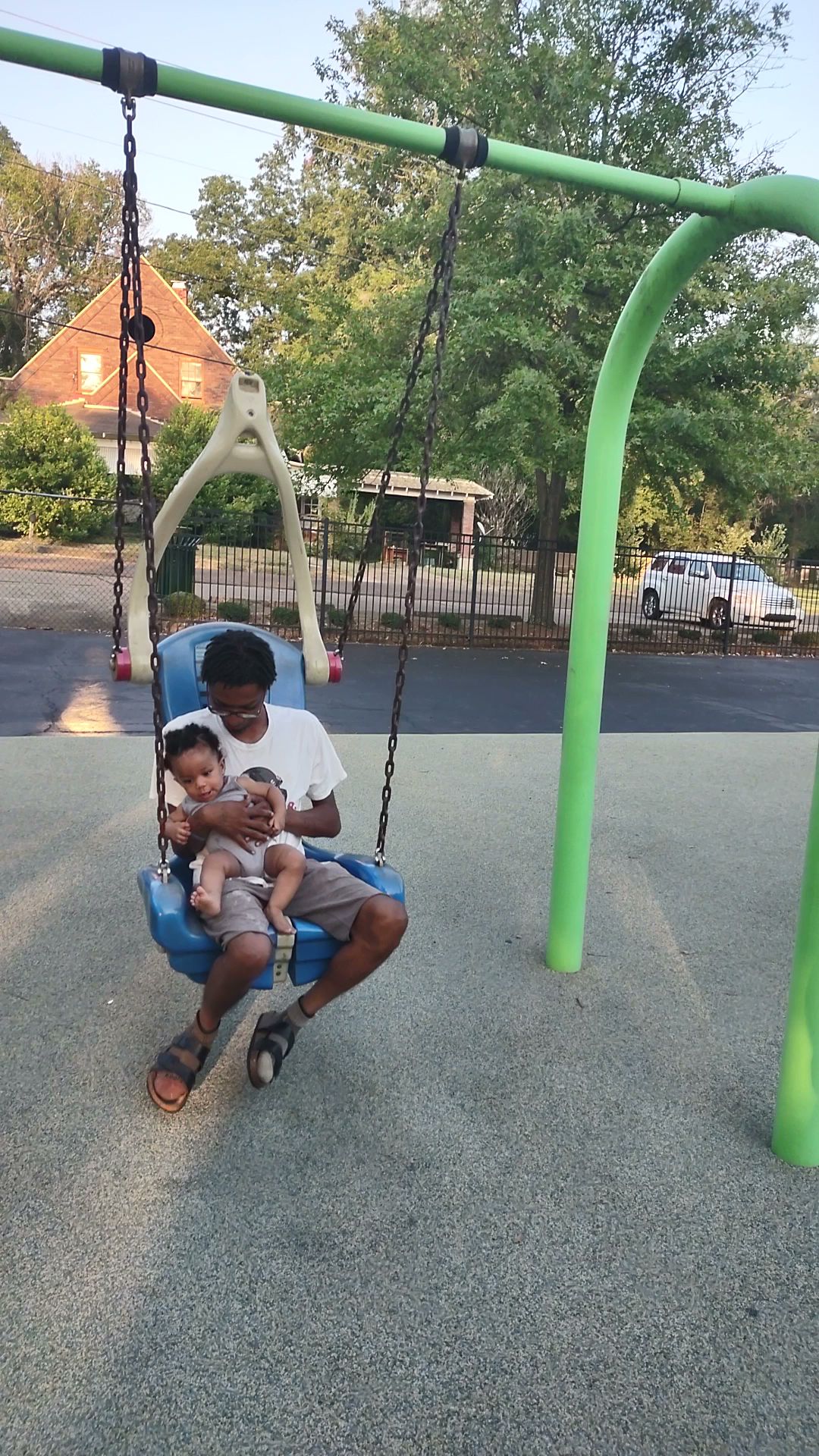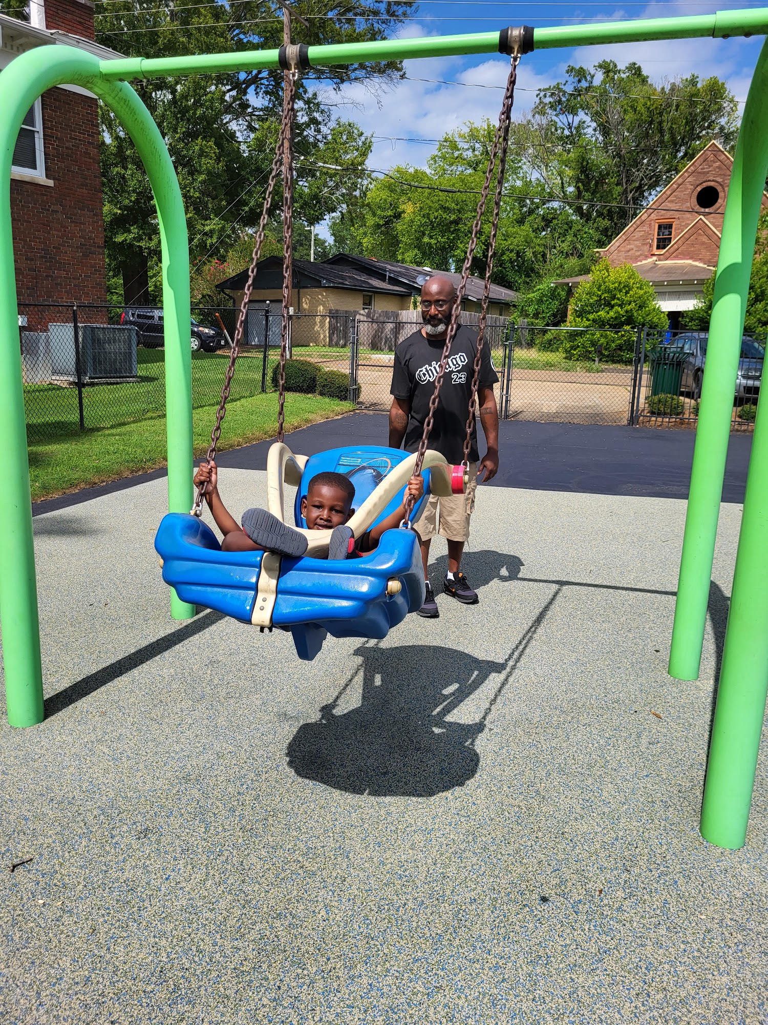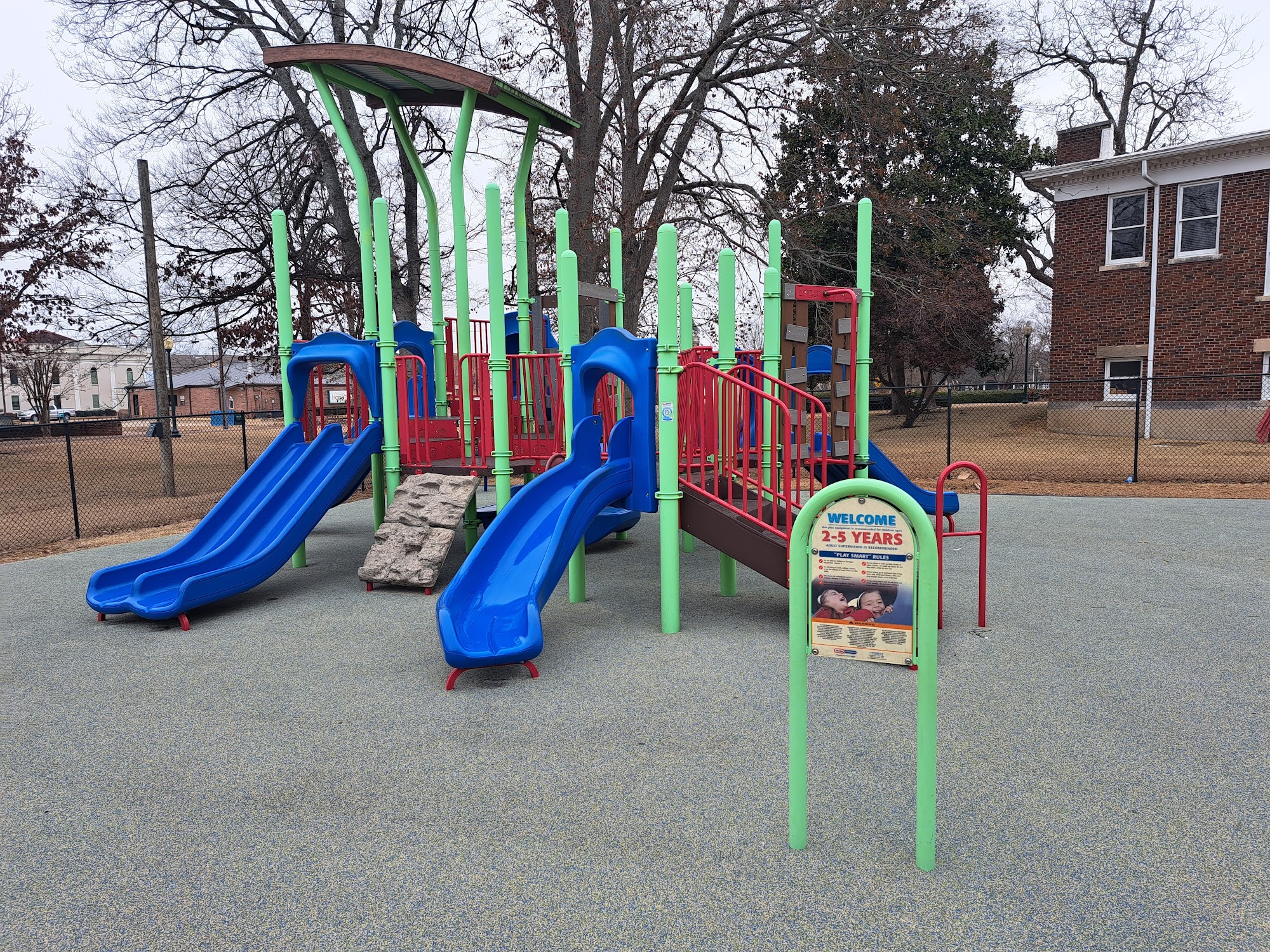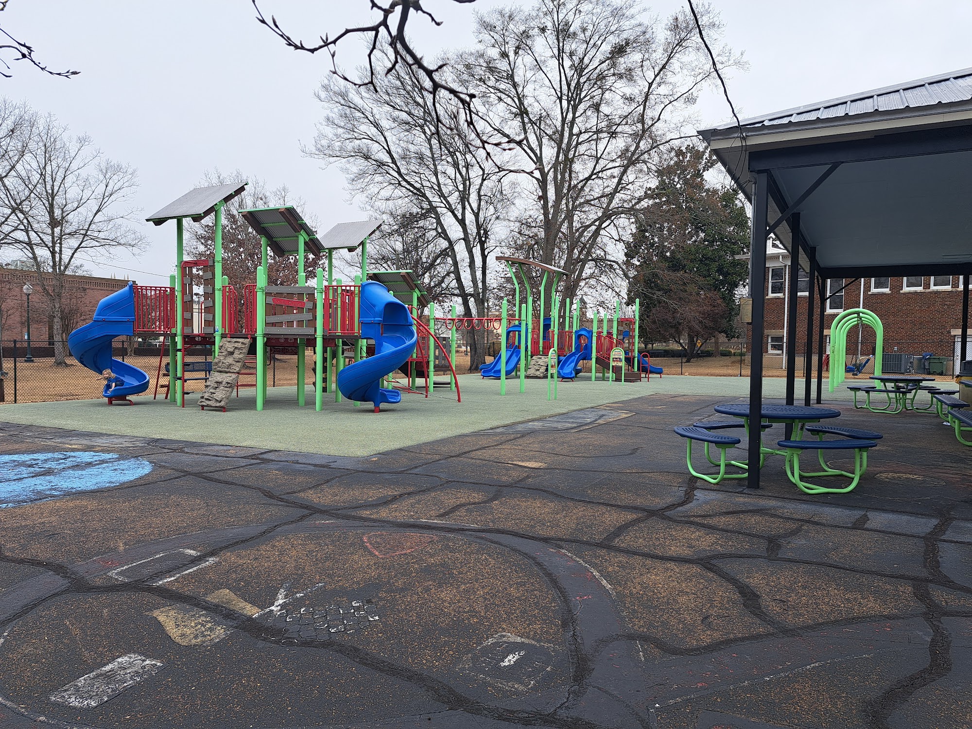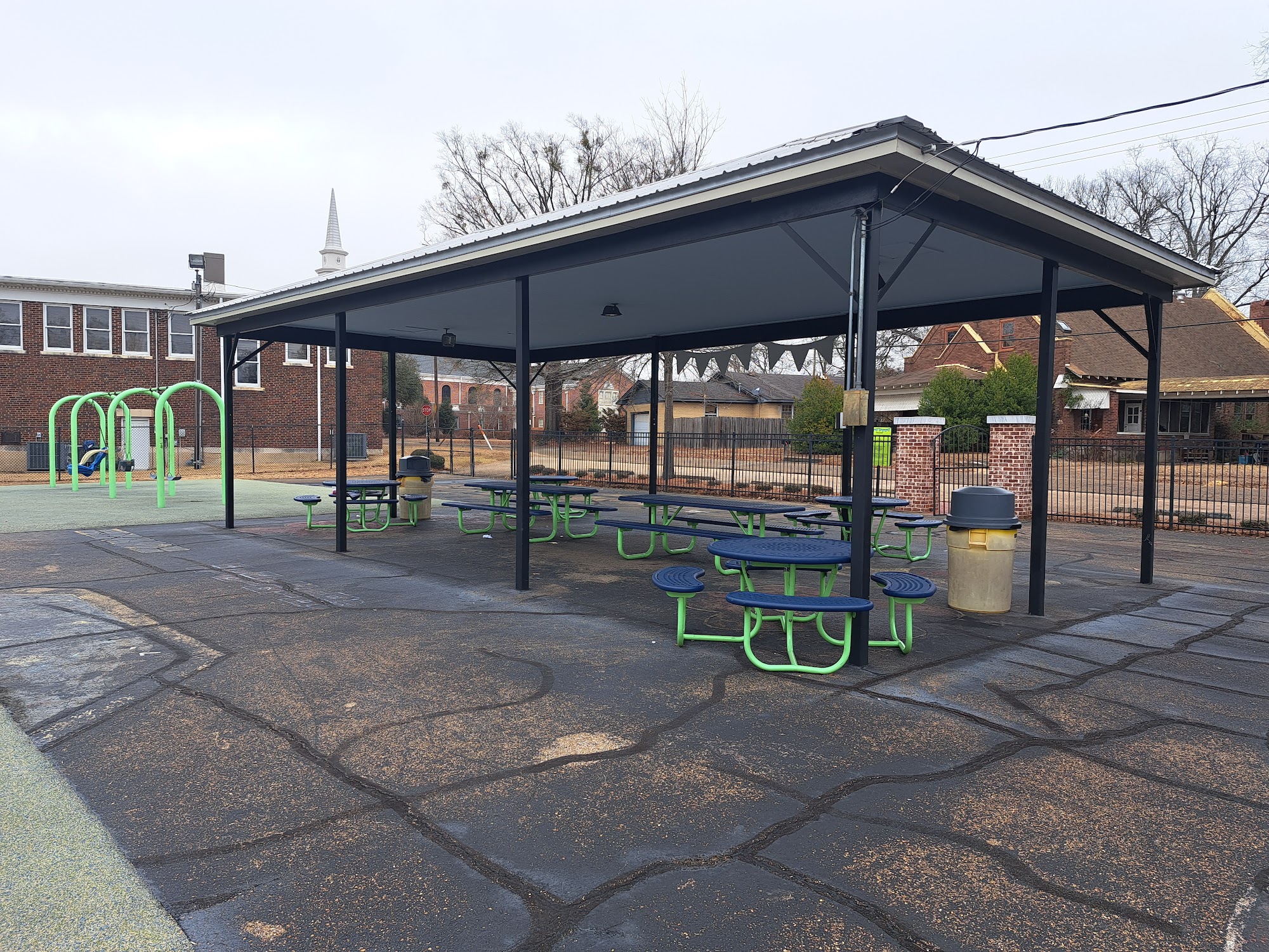 Decent fenced in playground with 2 play structures, sail canopies to provide shade and a large pavilion with picnic tables. There are no bathrooms and limited parking.