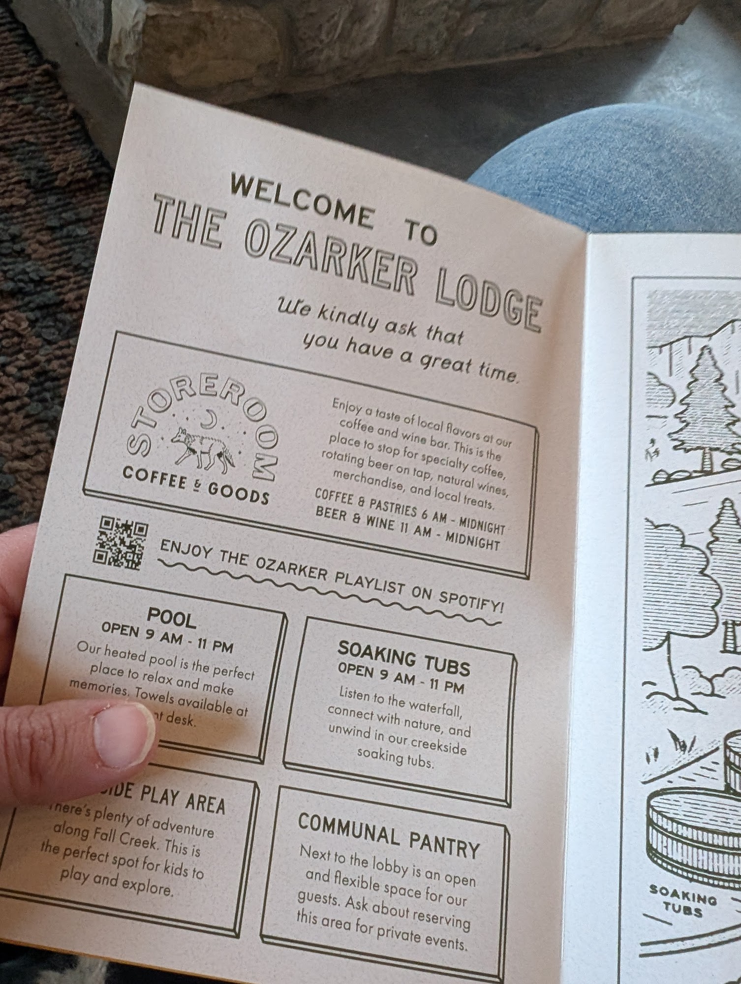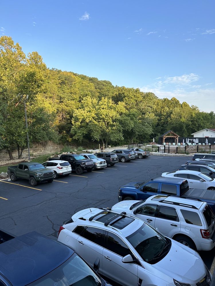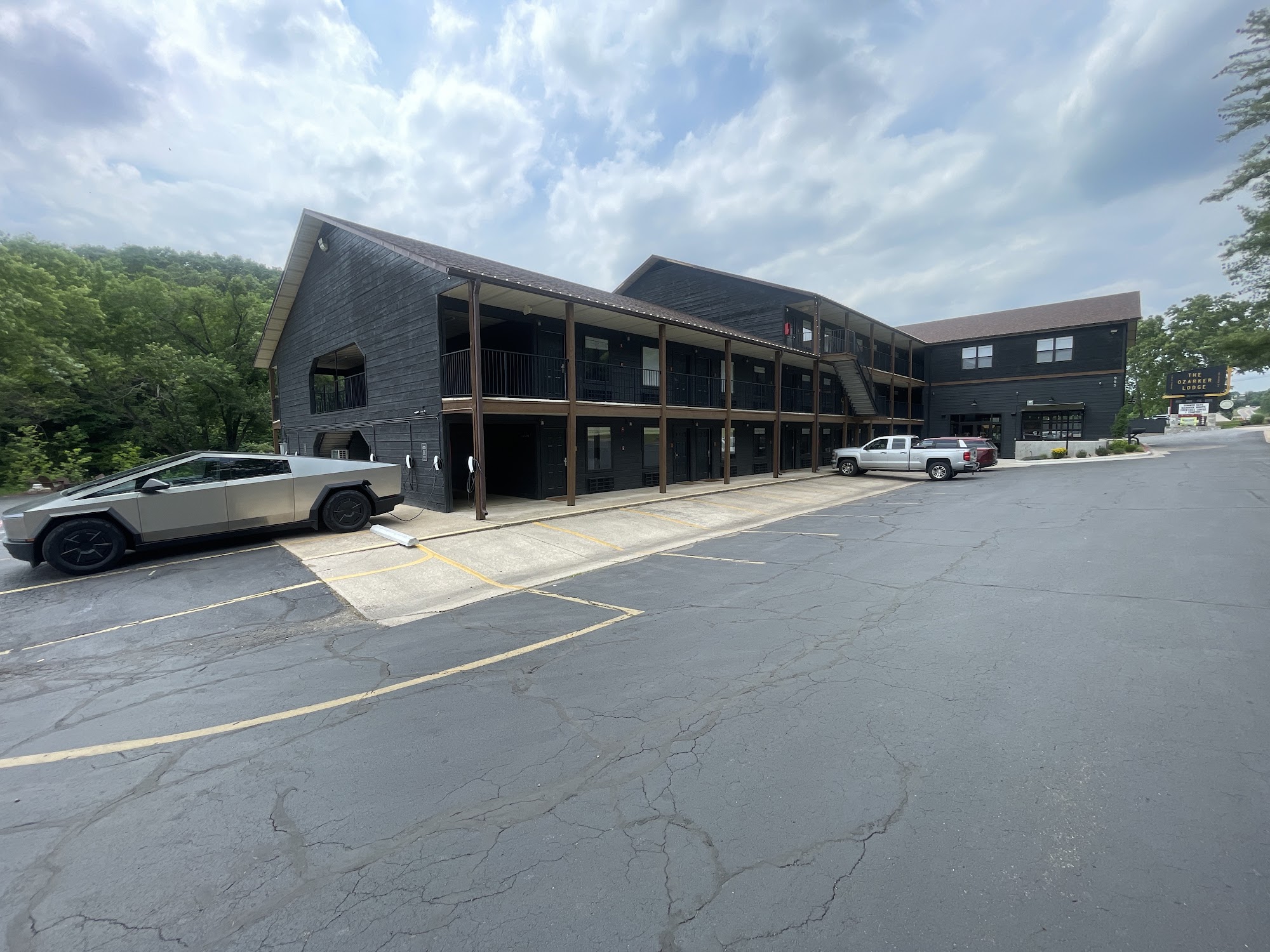 The Ozarker Lodge is a well maintained and clean family motel, reimagined from an old school motel. It offers a peaceful, quiet stay tucked away in a nature setting off the main road, alongside a beautiful creek with a small waterfall and absolutely clear water. The atmosphere is amazing, with a beautiful and welcoming lobby, fire pits for social gathering, an outdoor pool, and hot tubs next to the creek. Rooms are average or lovely, and the lodge is pet friendly. Amenities include Tesla car chargers, a full bar and food service, and a nice continental breakfast. The staff is excellent, friendly, and helpful, providing great service. While walls are thin and the highway can be loud, it offers great value and an excellent overall experience.