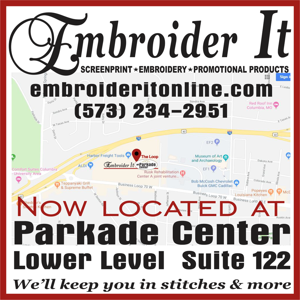 Embroider It provides custom Screen Print, Embroidery, Promotional Products, as well as apparel to embellish with Embroidery, Screenprint, etc. Our staff will be happy to help you create a design for your special event. We are located at 3501 Berrywood Drive, Columbia, Mo 65201. Give us a call, stop by our shop or check out our website. We look forward to working with you to give your project, event or business the extra touch that custom or personalized shirts, hats, mugs, pens, etc can provide.