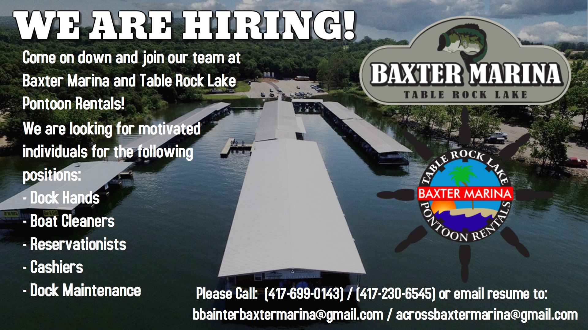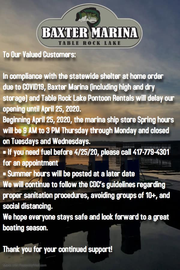 Baxter Marina is located in the middle of beautiful Ozark Mountain Country on Table Rock Lake. Baxter Marina offers many services including a full-service fuel dock ,boat rentals, wet and dry boat storage, and more. Come check us out!