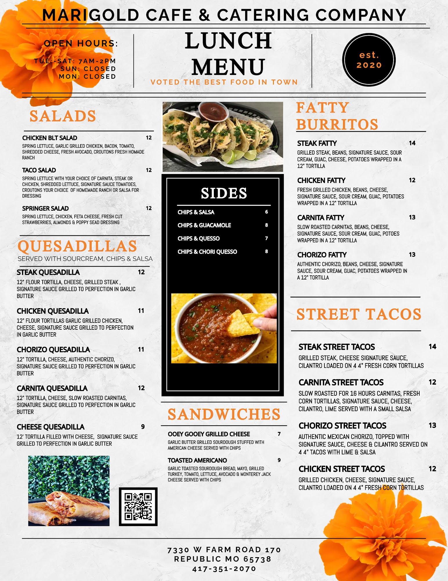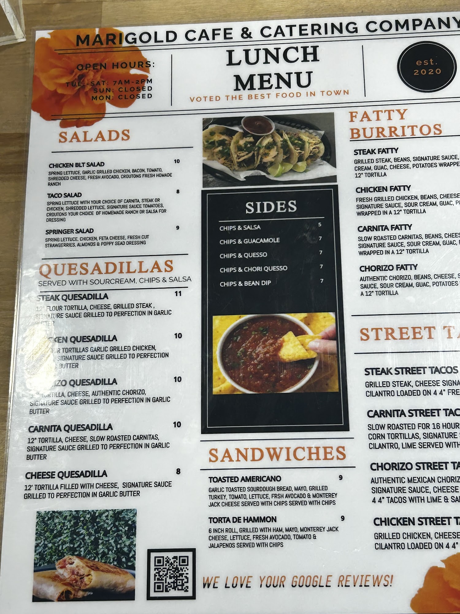 Marigold Cafe & Catering is a family-owned and operated scratch kitchen with a beautiful, clean modern space indoors and outdoors. It offers a menu with a Hispanic flare and an Italian touch, serving breakfast and lunch from 7-2, Tuesday through Saturday. The business is described as an absolute gem and a hidden-away gem that is a must-see. The food is consistently noted as fresh, very delicious, tasty, so flavorful, and amazing. Popular items include the chorizo burrito, biscuits and gravy, pancakes, hashbrowns that resemble amazing homemade potato cakes, and the large chicken taco fatty burrito which is enough for two meals. They also offer breakfast yummies and specialized coffee and soda drinks. Portions are generous and reasonably priced, with many items providing enough for two breakfasts. The service is fast for to-go orders via a drive-through window. Their catering service is highly recommended for events, with the team described as exceptional, attentive, and lovely to do business with, ensuring every detail is handled. The atmosphere and employees are generally loved. While an isolated incident involving a bug in food was noted, it was promptly remade. Customers frequently express they will become regulars and highly recommend it for exceptional food and catering.