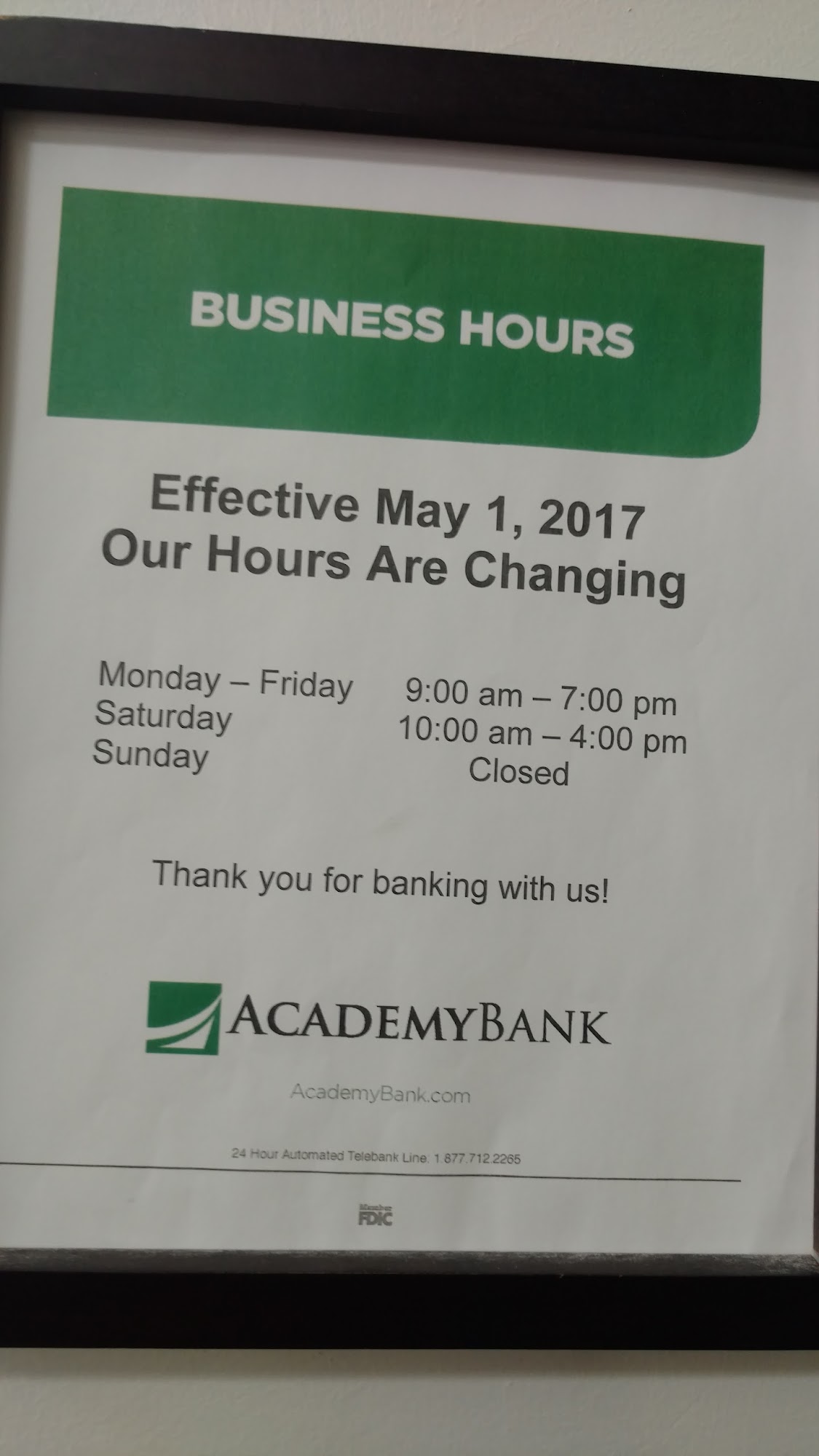 The staff at this particular Academy bank are always very courteous and has very fast service. Great bank