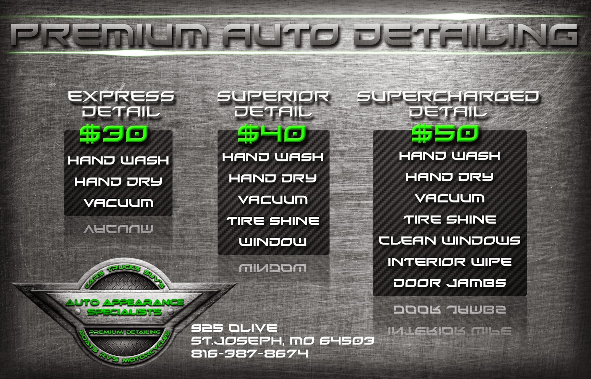 Auto Appearance Specialists in St. Joseph is a trusted auto detailing and protection shop with over 20 years of experience. The certified team provides a wide range of services, including interior and exterior detailing, hand car washes, paint correction, headlight restoration, odor and stain removal, engine bay cleaning, upholstery and carpet shampooing, leather conditioning, pet hair removal, clay bar treatments, scratch repair, rim polishing, and wheel cleaning. They also offer services for RVs, boats, motorcycles, fleets, and commercial vehicles, along with custom wraps, window tinting, and protection packages. Customers consistently praise the team for their hard work, meticulous attention to detail, and affordability. Many mention that the work exceeds expectations, making vehicles look brand new, with some describing the results as “like new” or “good as new.” The staff is responsive, professional, and helpful, often accommodating quick turnarounds and flexible drop-off arrangements. Clients appreciate the variety of cost-effective packages and the thoroughness of the work, including ceramic coatings, paint enhancement, and scratch removal. Overall, Auto Appearance Specialists is highly recommended for anyone seeking quality auto detailing, tinting, or protection services.
