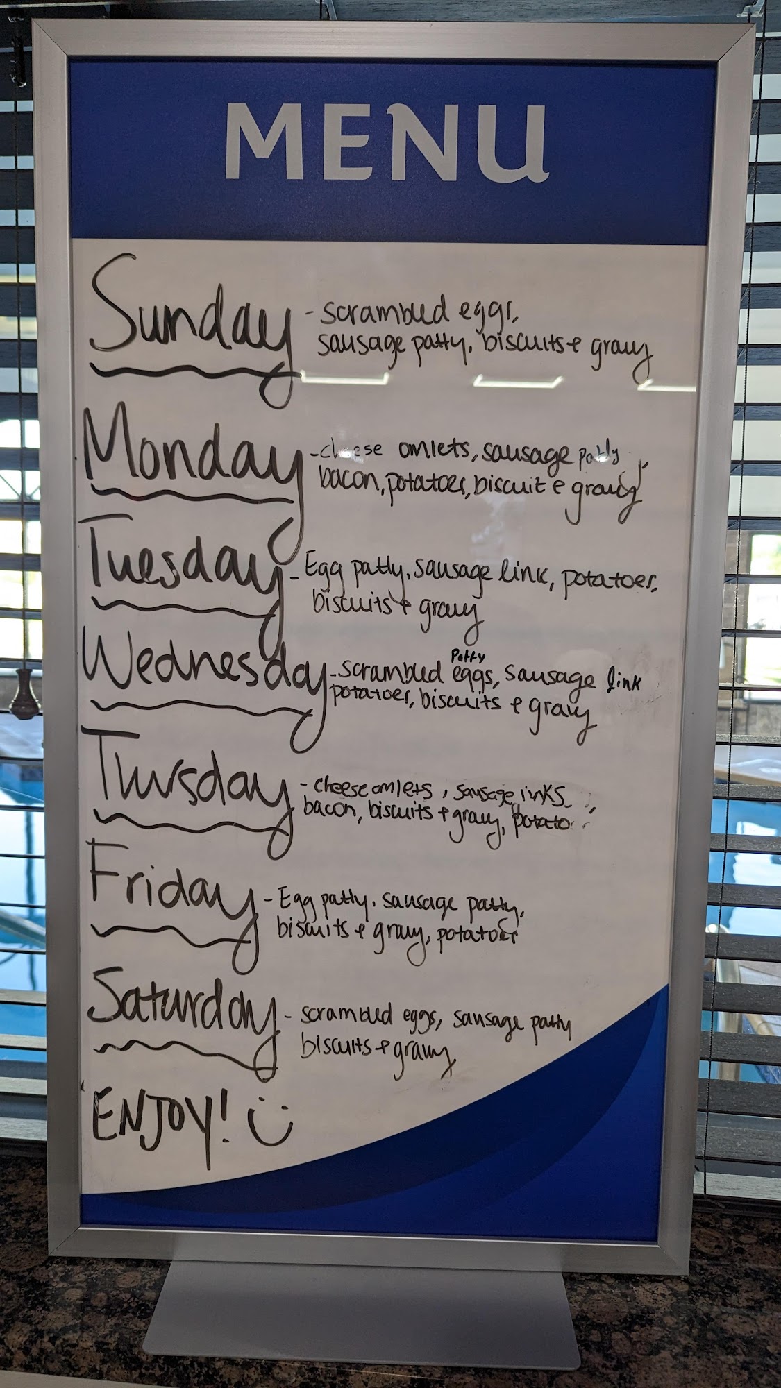 Nice place. Excellent staff. The guy that works day shift was great. Good breakfast indoor pool. I spent four days there not a problem it was a good stay.