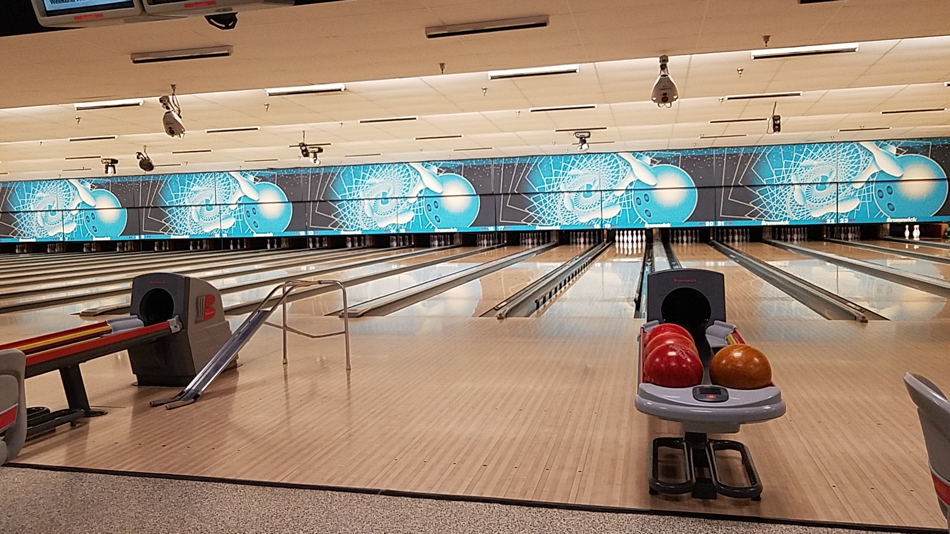 We didn't have to wait at all, the shoes and balls were good. The lane was dirty, but everything ends was on good condition. Lots of arcade games