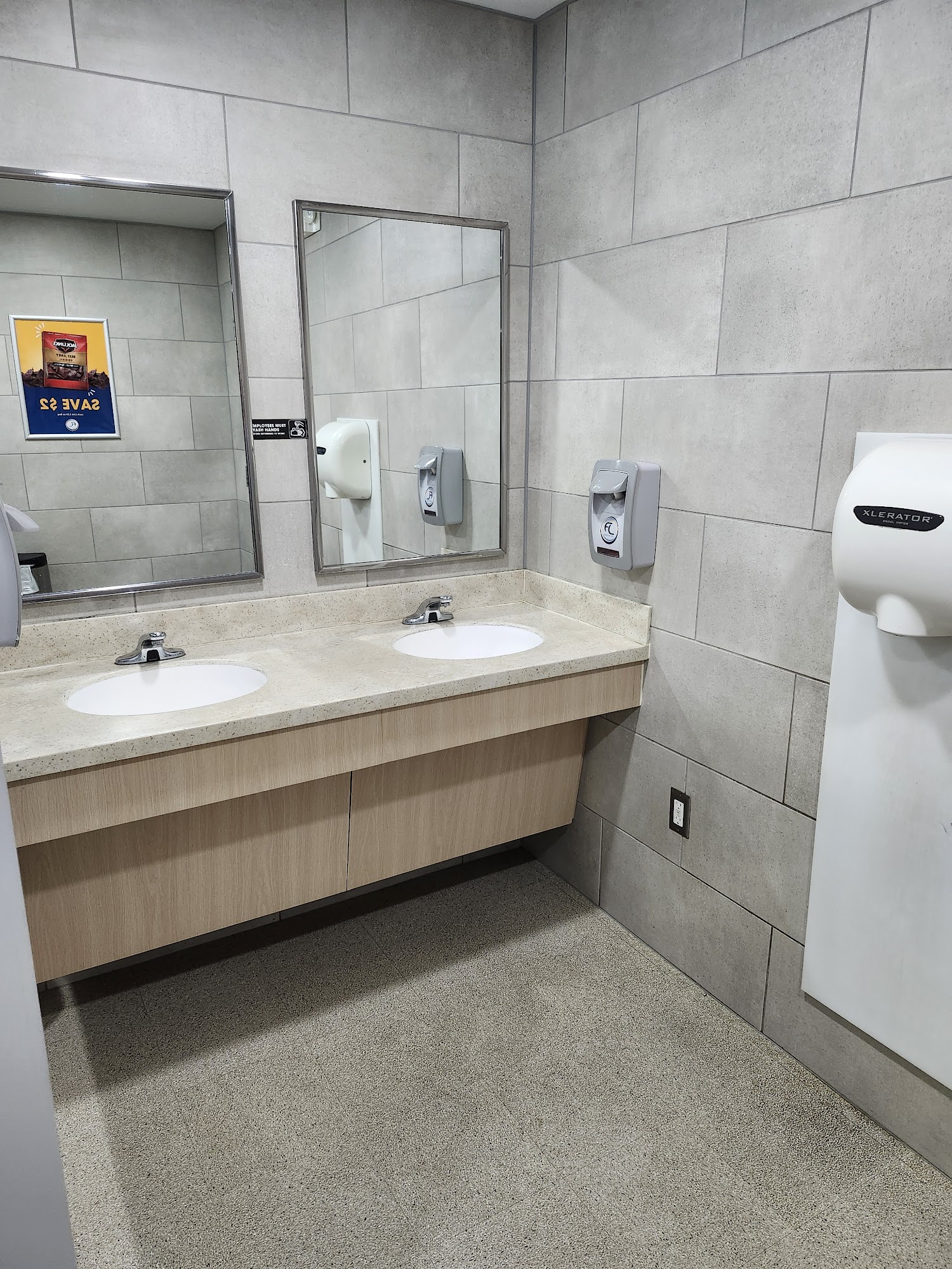Very clean restrooms, good selection of drinks and snacks. McDonald’s located inside. Employees are very friendly. Lots of space at gas and separate diesel pumps for a small to midsize camper. Grassy area to walk pets.