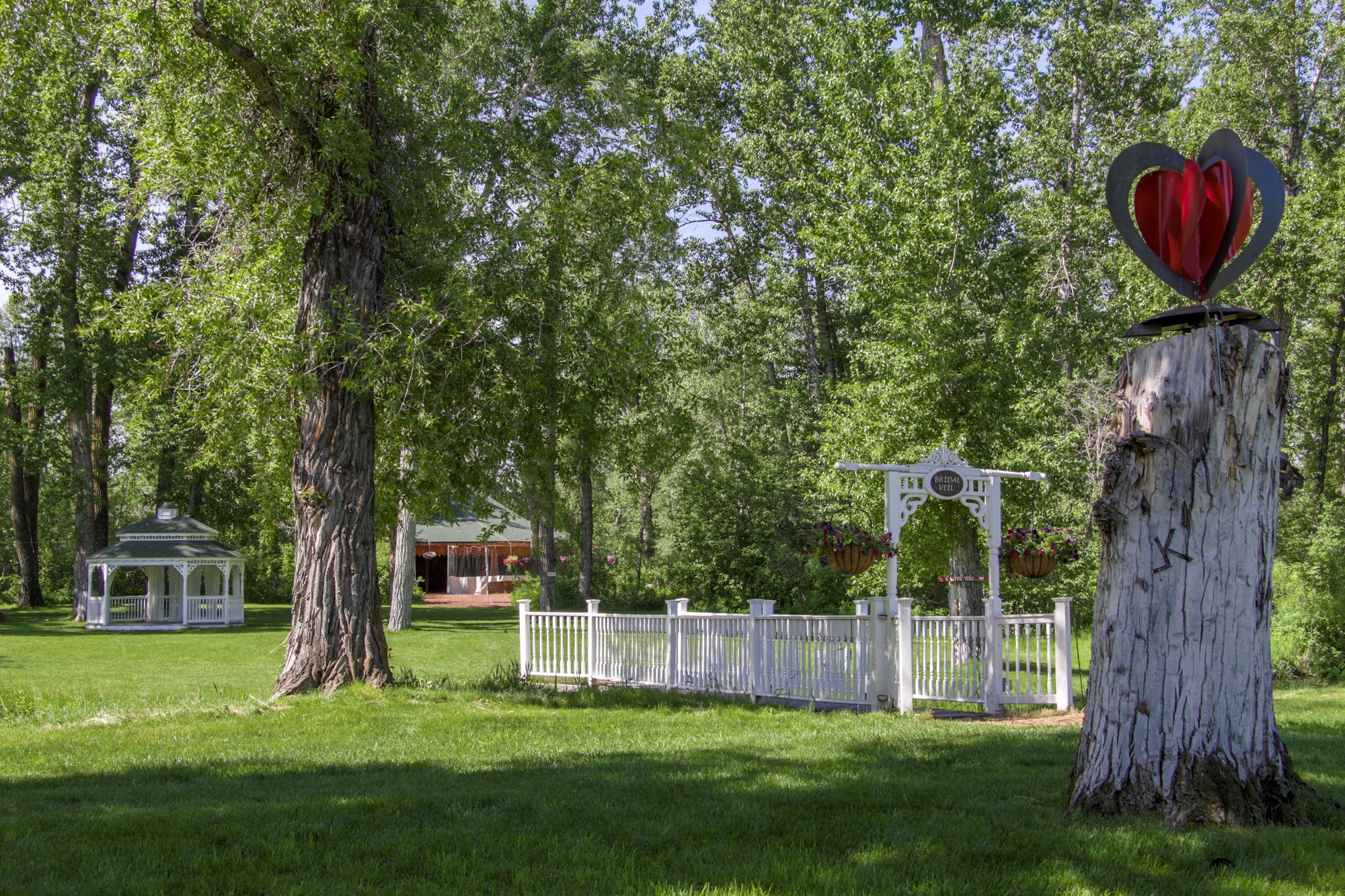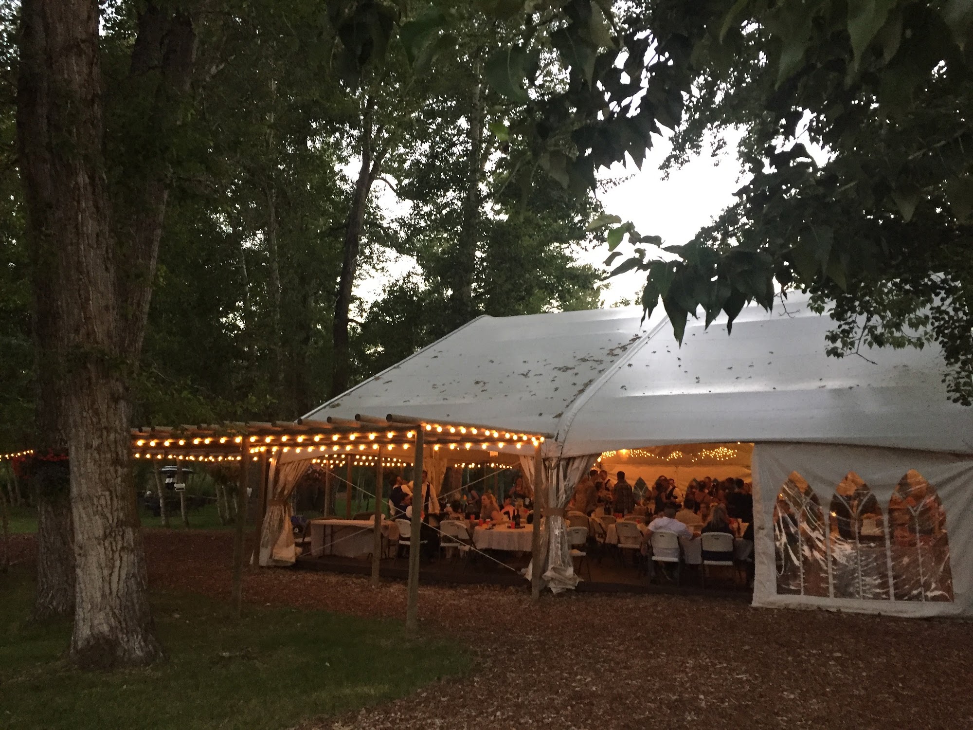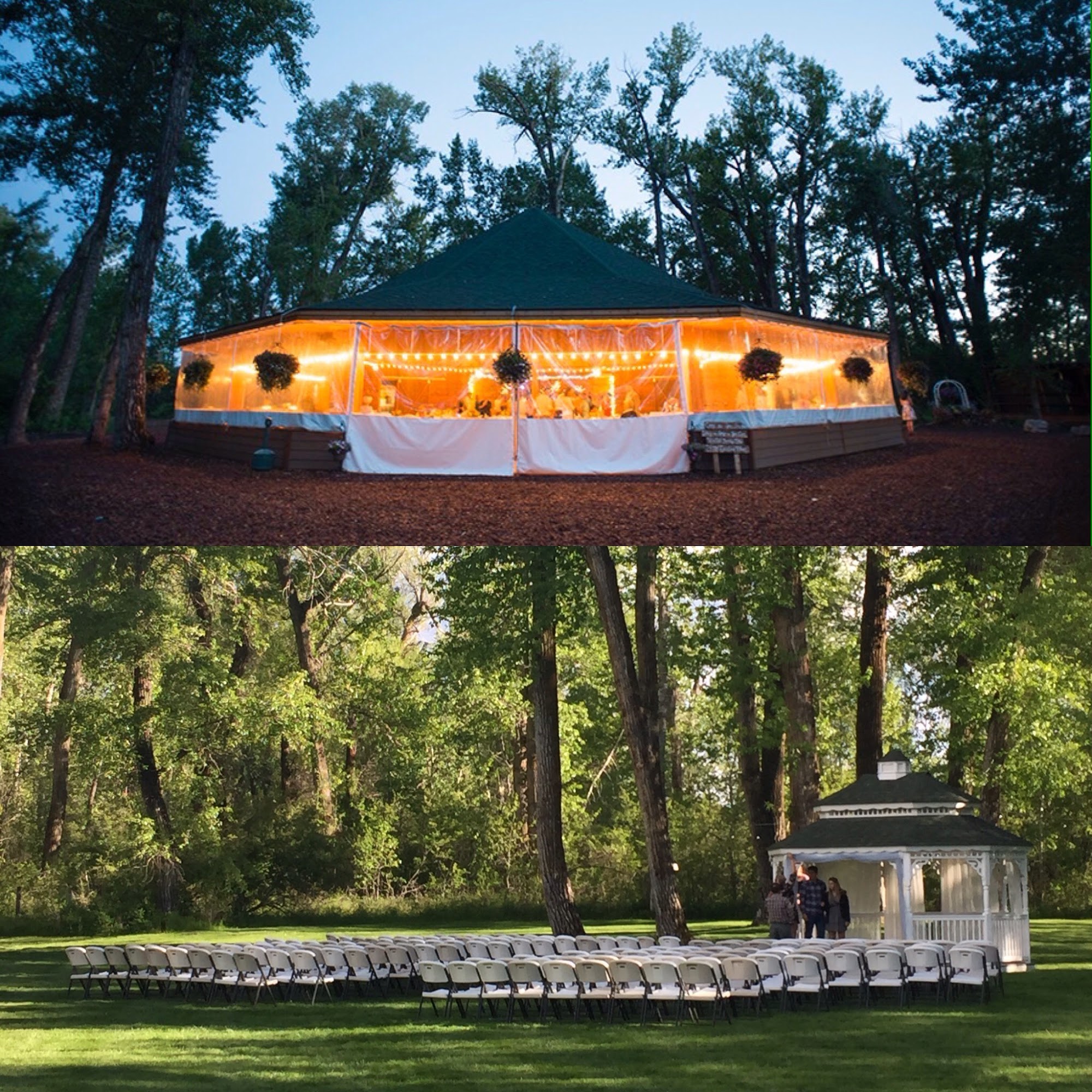Gallatin River Hideaway is Bozeman’s top 2 venues, "Creekside" or "Bridal Veil". Both provide the perfect setting for your wedding ceremony, reception, party or corporate event. The Gallatin Creek winds its way among the tall cottonwoods and aspens and through both venues. We are LGTBQIA friendly. All are welcome here! Both Creekside and Bridalveil offer the option of “indoor” or outdoor use. The pavilions can be opened for an outdoor feel, or closed for a cathedral atmosphere. Each include dance floor, stage, gazebo, grassy meadows, Edison lights in the trees, horseshoe pits, fire pit, outdoor seating, tables and chairs, 2 tap keg bar, speaker with mic & stand, flush toilet restrooms, catering kitchen, kid’s play area.