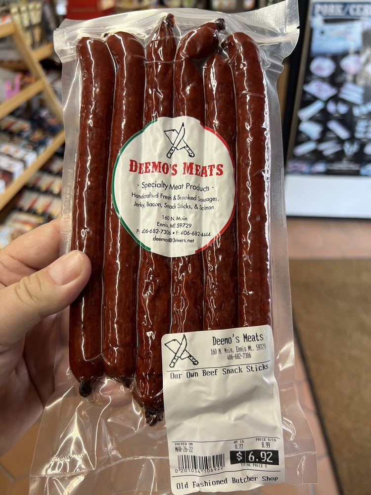 Deemo's Meat is a popular and well-loved meat shop in Montana, known for its clean and welcoming environment with a wonderful smell. The store offers a wide selection of high-quality meats, including steaks, veal cutlets, and tender, well-trimmed Tri Tip. Customers appreciate the friendly staff who go above and beyond, even vacuum packing meats. Beyond meats, the store features a variety of extras such as noodles, vegetables, spices, cheeses, pickled items, and ready-to-cook pizzas, making it more than just a meat market. The owner is helpful and knowledgeable, often assisting customers with their needs, including preparing ingredients for homemade meals. The shop is also famous for its amazing jerky, considered the best by many. Overall, Deemo's Meat is a must-visit for those seeking quality meats and a range of specialty items in a friendly atmosphere.