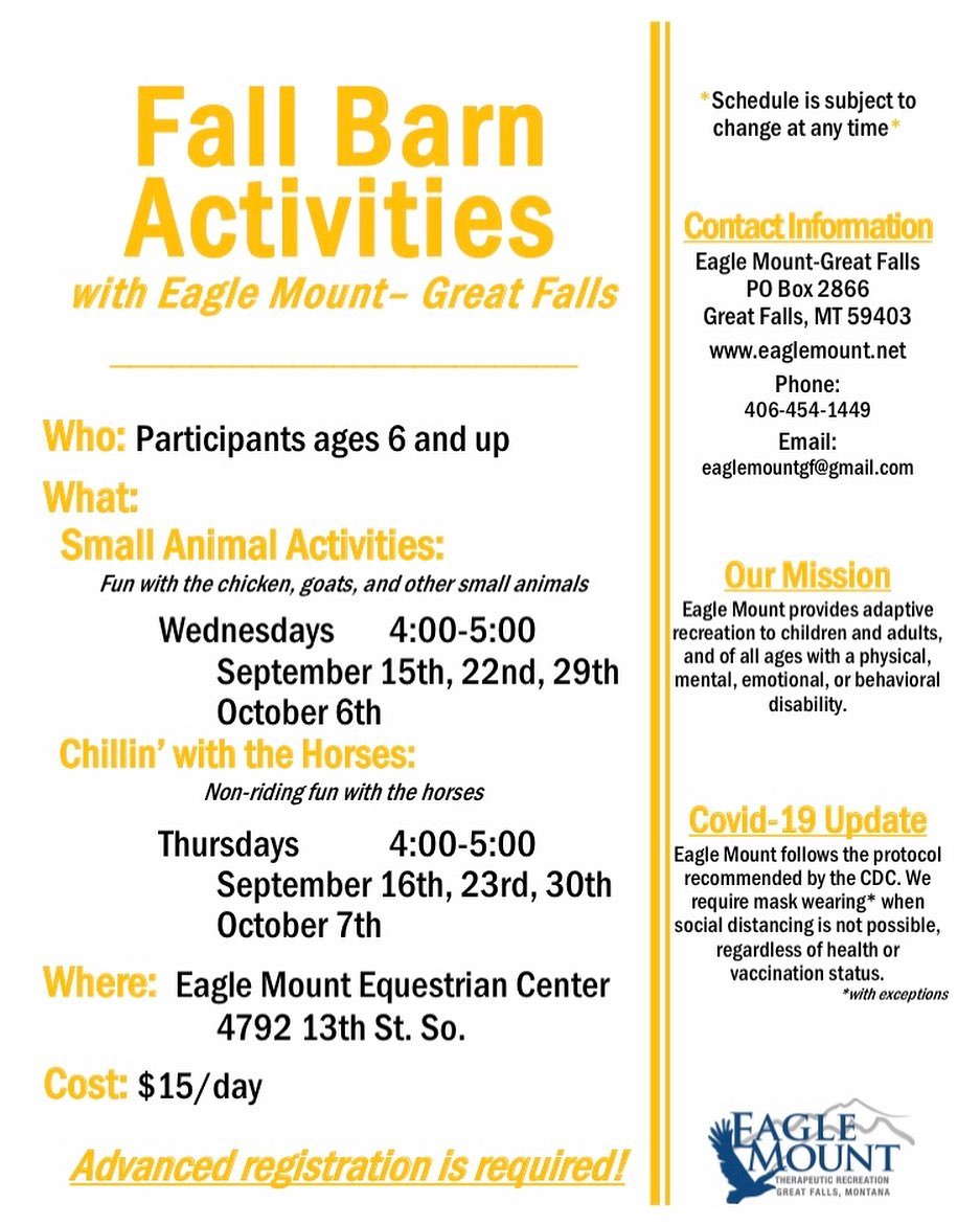 Eagle Mount Great Falls provides therapeutic and recreational activities for children and adults of all ages with physical, developmental, behavioral and/or mental challenges, striving to improve the quality of life for them and their families. Founded in Great Falls, MT in 1990.