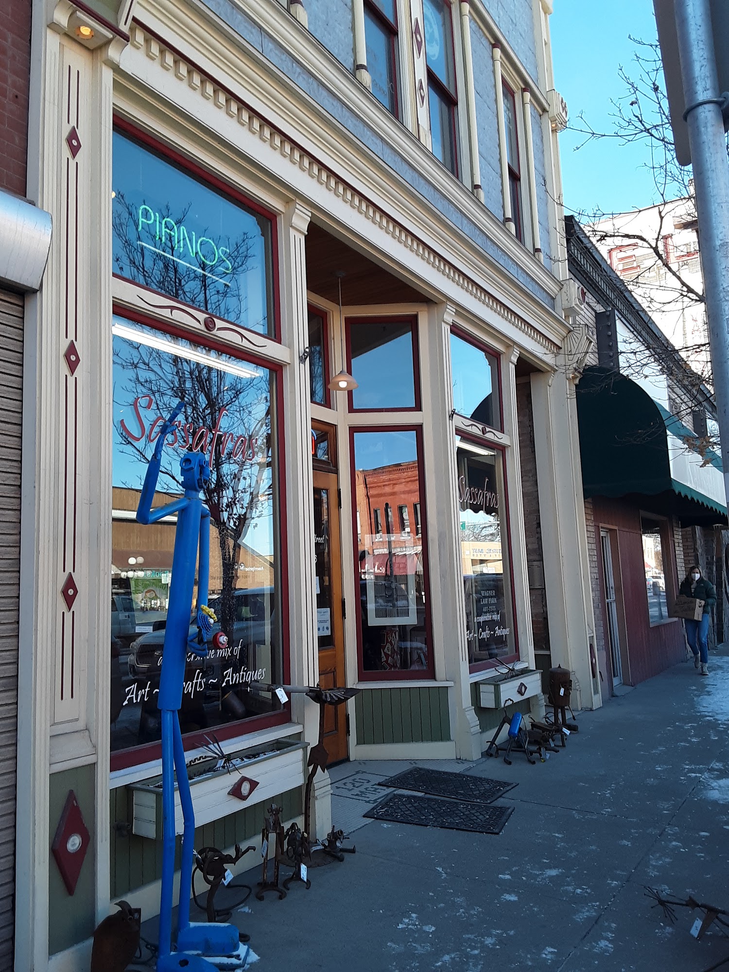 Sassafras represents the work of over 50 artisans whose traditional and eclectic mix of art and crafts include paintings, photography, mixed media, turned wood, hand blown glass, mosaics, a variety of fiber arts, and a great selection of jewelry and cards. You’ll also find a variety of handmade and re-purposed furniture, vintage collectibles along with restored antiques and pianos all beautifully displayed in the Historic 1892 Brewery Saloon building.
