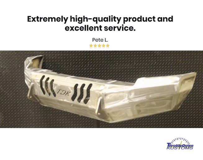 Throttle Down Kustoms Inc. designs and manufacturers rugged, high-quality, aftermarket truck and van bumpers as well as full replacement frames for Jeeps and Ford Broncos. With nearly two decades in the industry, the company helps customers venture further. Reviews consistently praise the outstanding craftsmanship and solid, American-made products. Customers describe the frames as very well made, tougher than the original, and outstanding. The top-quality bumpers are noted for integrating well with vehicle systems like front cameras and parking sensors. The company also provides a very experienced installation service, which customers find valuable. Many highlight excellent service, with orders arriving almost two months sooner than expected and in amazing condition. The shipping process is described as easy. Overall, customers report being very happy, very impressed, very pleased, and having no regrets, even when traveling long distances for service. The business is called a great and outstanding company.