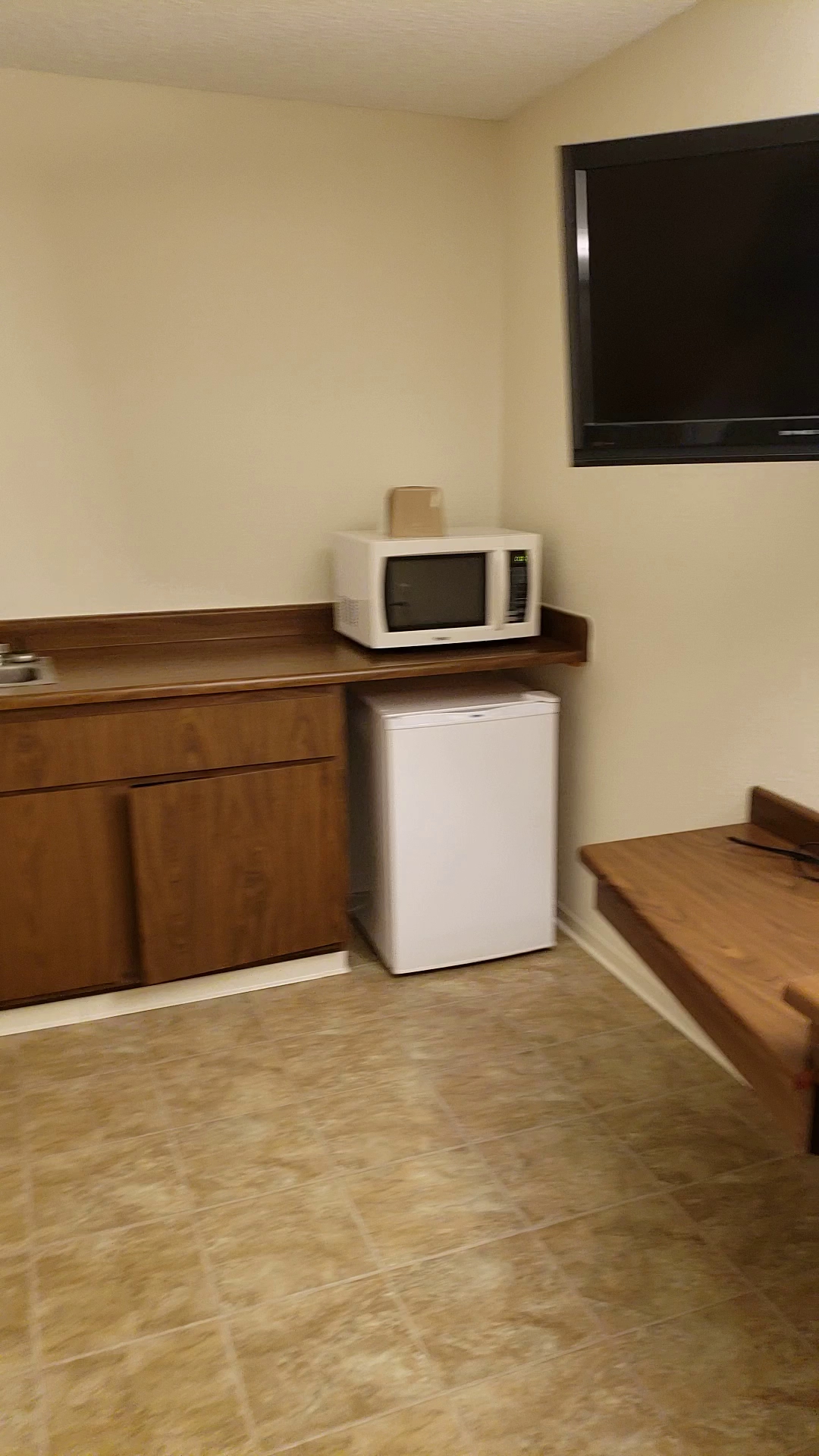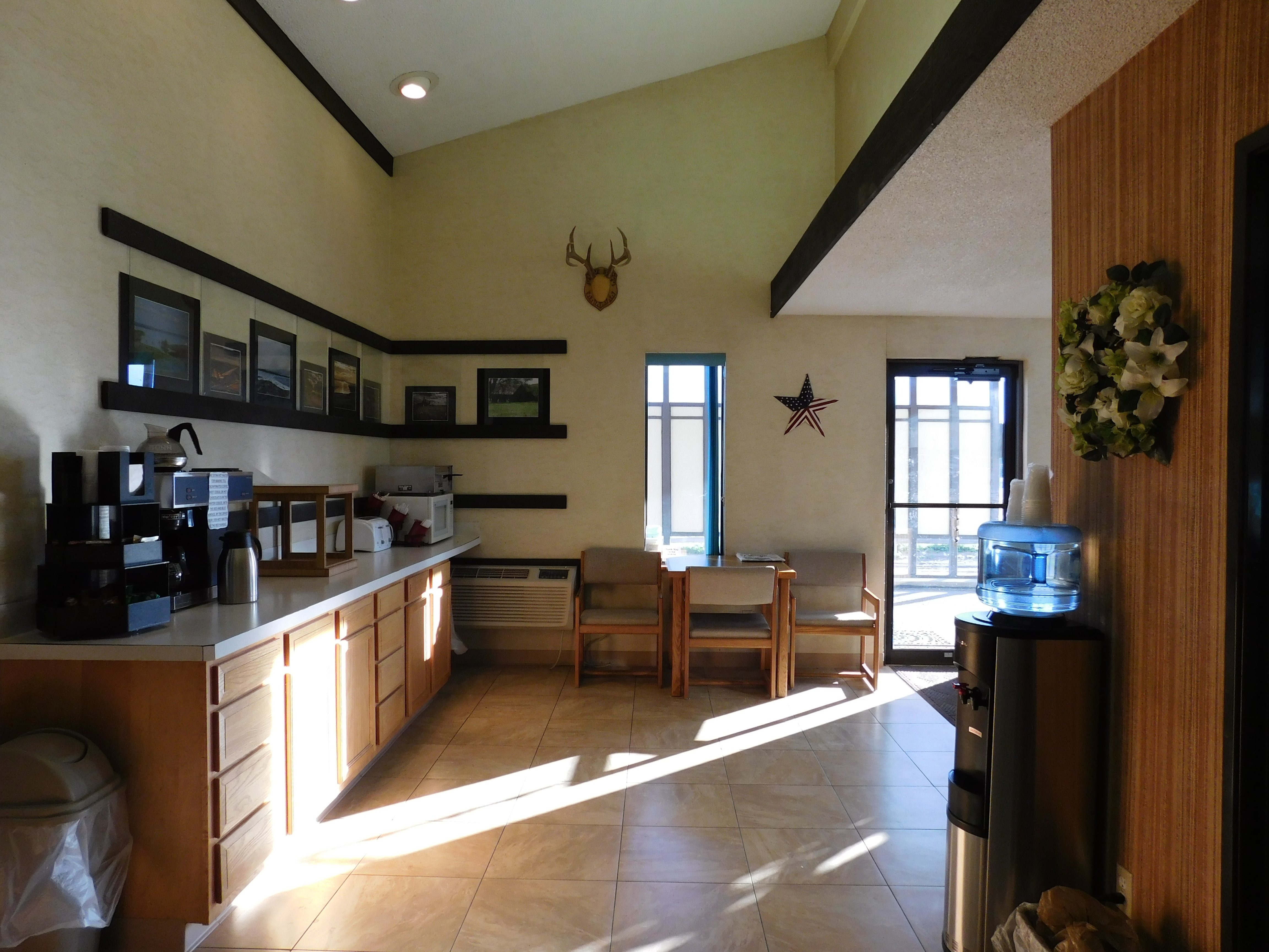 Room was alright but needed some repairs and clean chairs, they were stained & dirty. Back doors were interesting.. one needed new lock, other had a mat rolled up in it to keep it open. Room doors were all banged up. Probably won't stay there again.