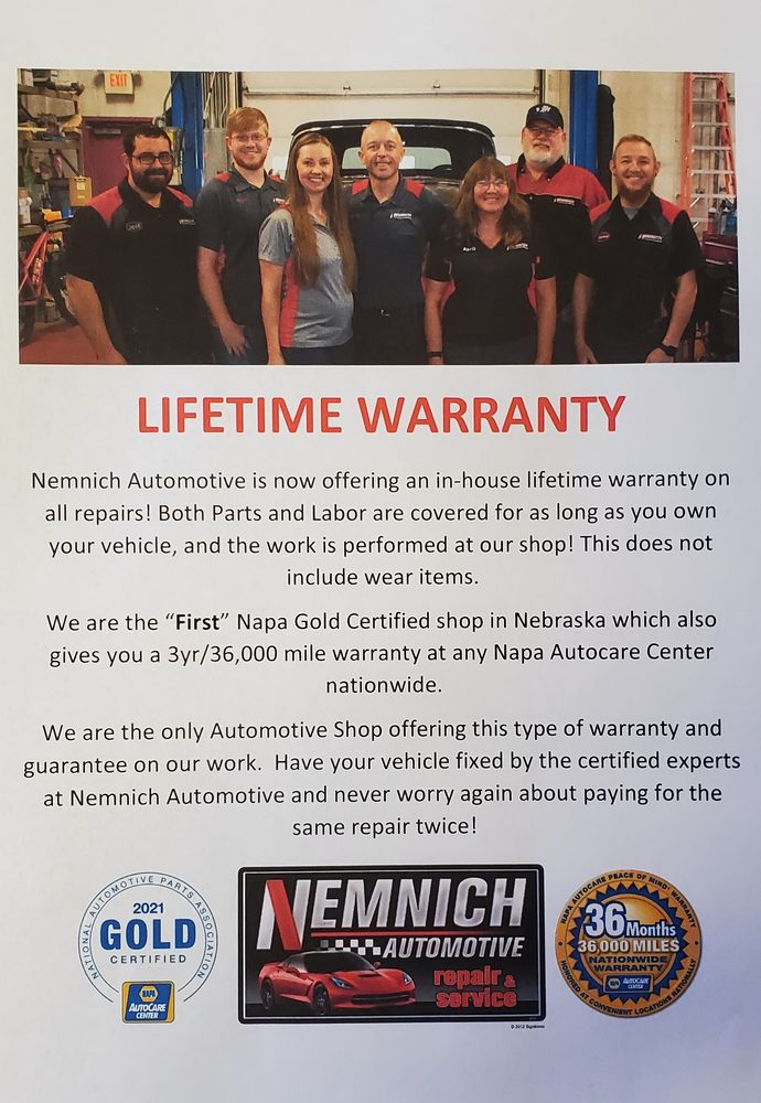 Nemnich Automotive is a family-owned and operated automotive repair shop in Gering, Nebraska. They specialize in repair and diagnostics for both foreign and domestic vehicles, including light duty diesel. As a Napa Gold Certified shop, they offer affordable rates and Gold Class Service. Their technicians perform a wide range of services from oil changes, brake repairs, wheel alignments, and suspension work to diagnosing check engine, ABS, and airbag lights, emphasizing that safety is just as important as performance. Reviews consistently highlight the most professional, friendly, and thorough service. Customers report great, professional service from start to finish, with the team keeping them updated on progress. The service is described as quick and reasonably priced. Many note the staff is super friendly, knowledgeable, and provides excellent customer service that is above and beyond, treating customers like family and gaining their trust and respect. This reliable and professional care provides peace of mind, leaving customers very satisfied and highly recommending the business, with some stating they have gained a new customer.