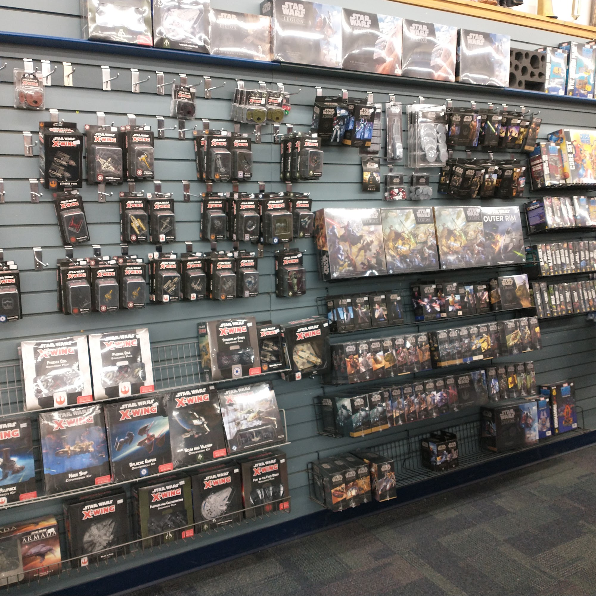 This is a very nice local gaming store with a large gaming area in the back and a huge variety of both brand new and also used games and gaming supplies. Warhammer, magic the gathering, board games, card games, miniature painting supplies, dice, and showcases of painted miniature models for sale.