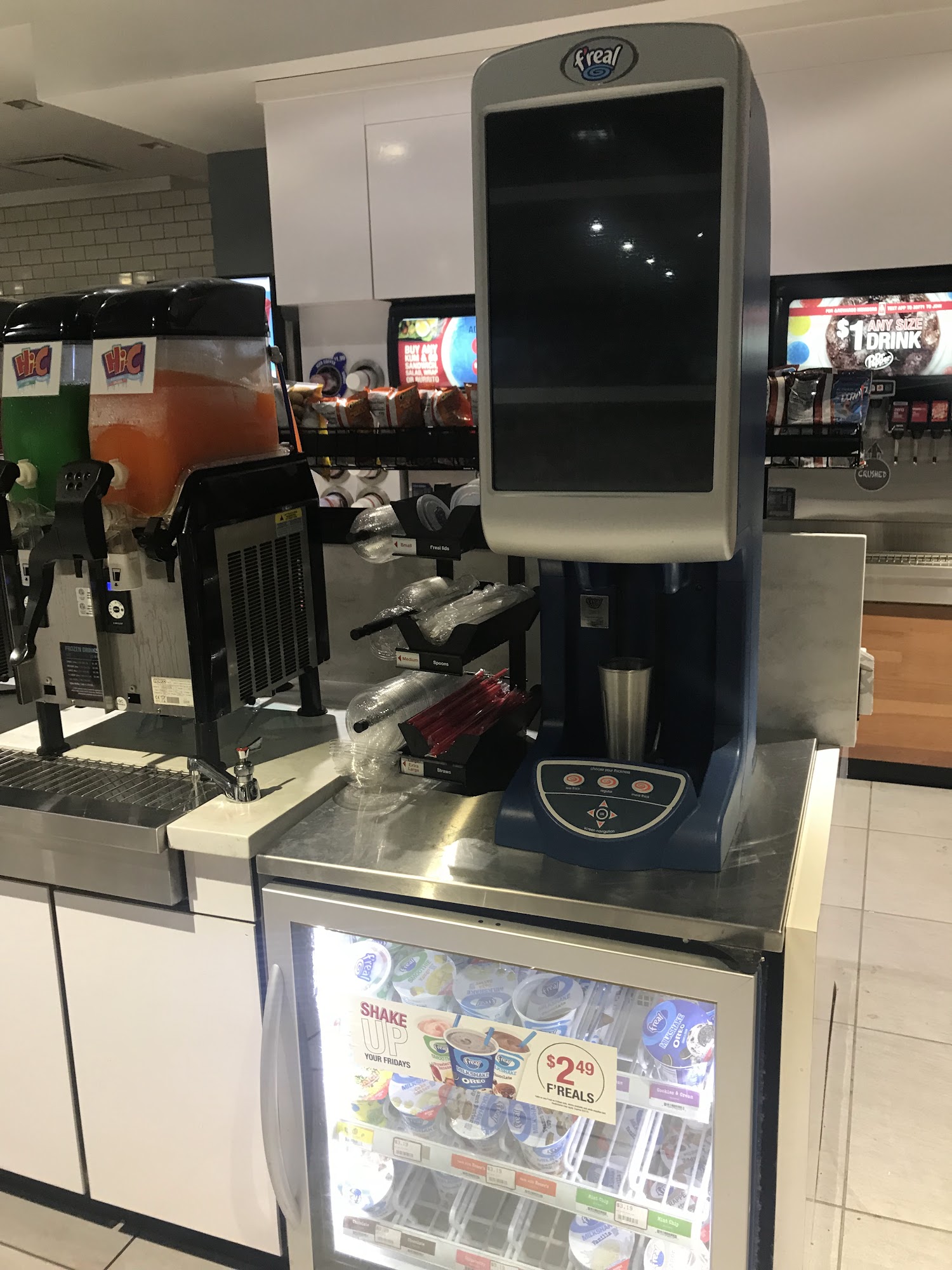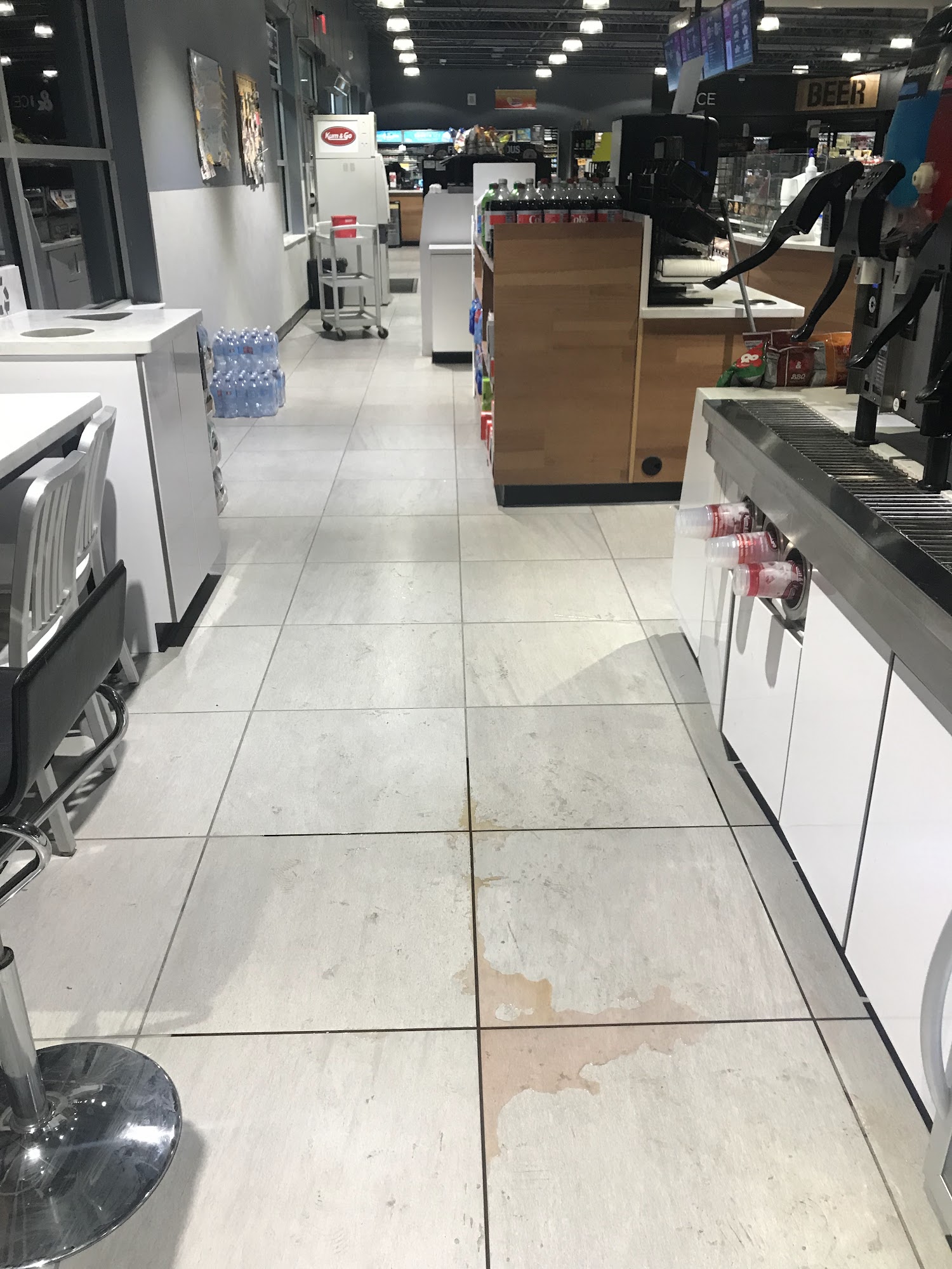 Men's restroom was flooded, a urinal out of order, no toilet paper and no soap to was hands, the bathroom stall door was broken. Only appeared one person was working. Absolutely disgusting and unacceptable.