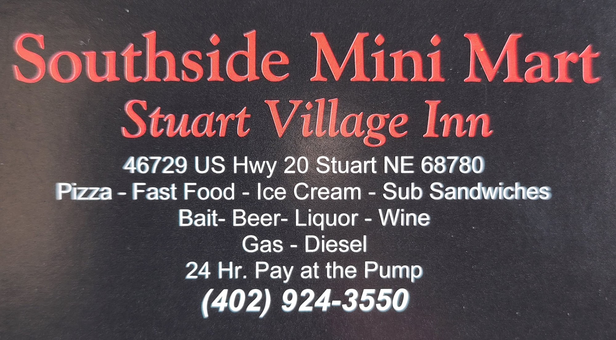 Southside Mini Mart is a neat convenience store in Stuart, NE, described as super nice and awesome. It is well-stocked, carrying items like bottled wines from area vineyards and live bait for fishermen. The store has clean bathrooms and a nice shower for truckers and drivers. Many find the food to be so amazing. However, their policy on credit cards requires a minimum purchase, which some find to be a silly, antediluvian rule. Drivers of all vehicles are welcome to wait and are made to feel welcome with no stress.