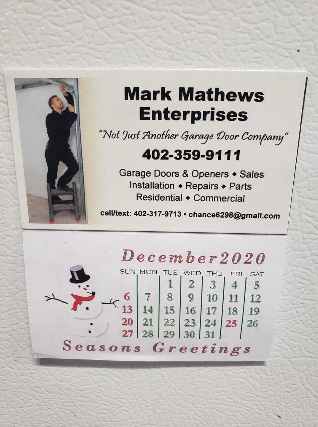 Mark Mathews Enterprises "Not just another garage door company" By that definition, not to say we're the biggest or even the best. It really means a lifetime of of being brought up to do the best at whatever you do. And after many years of searching what I wanted to do for a profession, it came to be garage door work. Dating back to 1981. And with that said, your garage door and garage door opener will be inspected not only visually for worn, cracked or needed parts (and all honesty, not to sell you parts) but, working the garage door by hand to make sure it is balanced and all adjustments are checked and brought to your attention. And needed parts, if any, are not inflated. Thank you, Past, present & future customers of mine.
