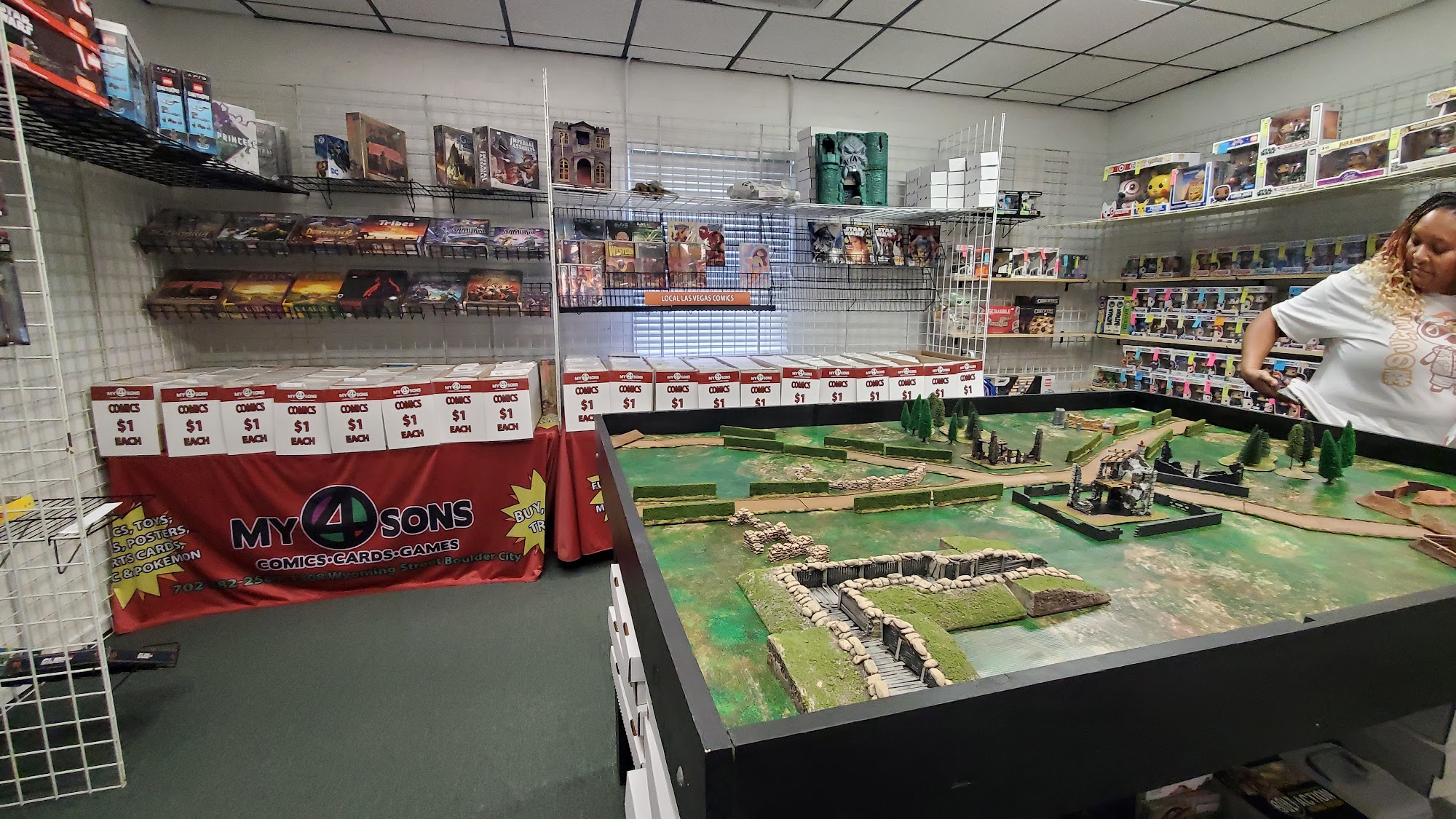 My 4 Sons Comic Cards is a great, cute, and awesome family-owned gaming shop. It is the best local game store for Star Wars Unlimited tournaments and has a thriving Lorcana scene. It is the only place in or near Vegas with both singles and some sealed product still. The shop offers lots of variety of games and game platforms, including MTG and Pokémon TCG sold there as well as release events. It features vintage arcade cabinets to play on and cool old toys, vintage Star Wars figures, Lego figures, comics, graded comics and cards, sports cards, and drinks and snacks. Items are reasonably priced with good deals and the owners are very nice, fair, friendly, knowledgeable, and provide amazing customer service. There are regular tournaments and it seems like a great place to visit and play at.