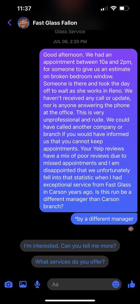 Fast Glass offers exceptional service with a focus on professionalism and efficiency. Customers have praised the company for their quick turnaround, with windshield replacements often completed in under 30 minutes. The team is known for being courteous and accommodating, even fitting clients in early when possible. Many have expressed their satisfaction with the competitive quotes and the quality of work, including fixing rock chips and window seals. Fast Glass has a strong reputation for outstanding customer service, making it a preferred choice for both quick repairs and more extensive glass needs.