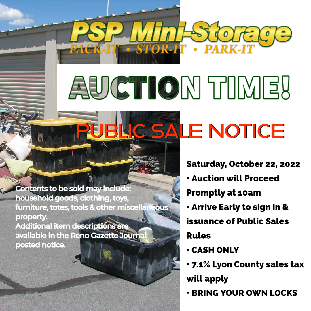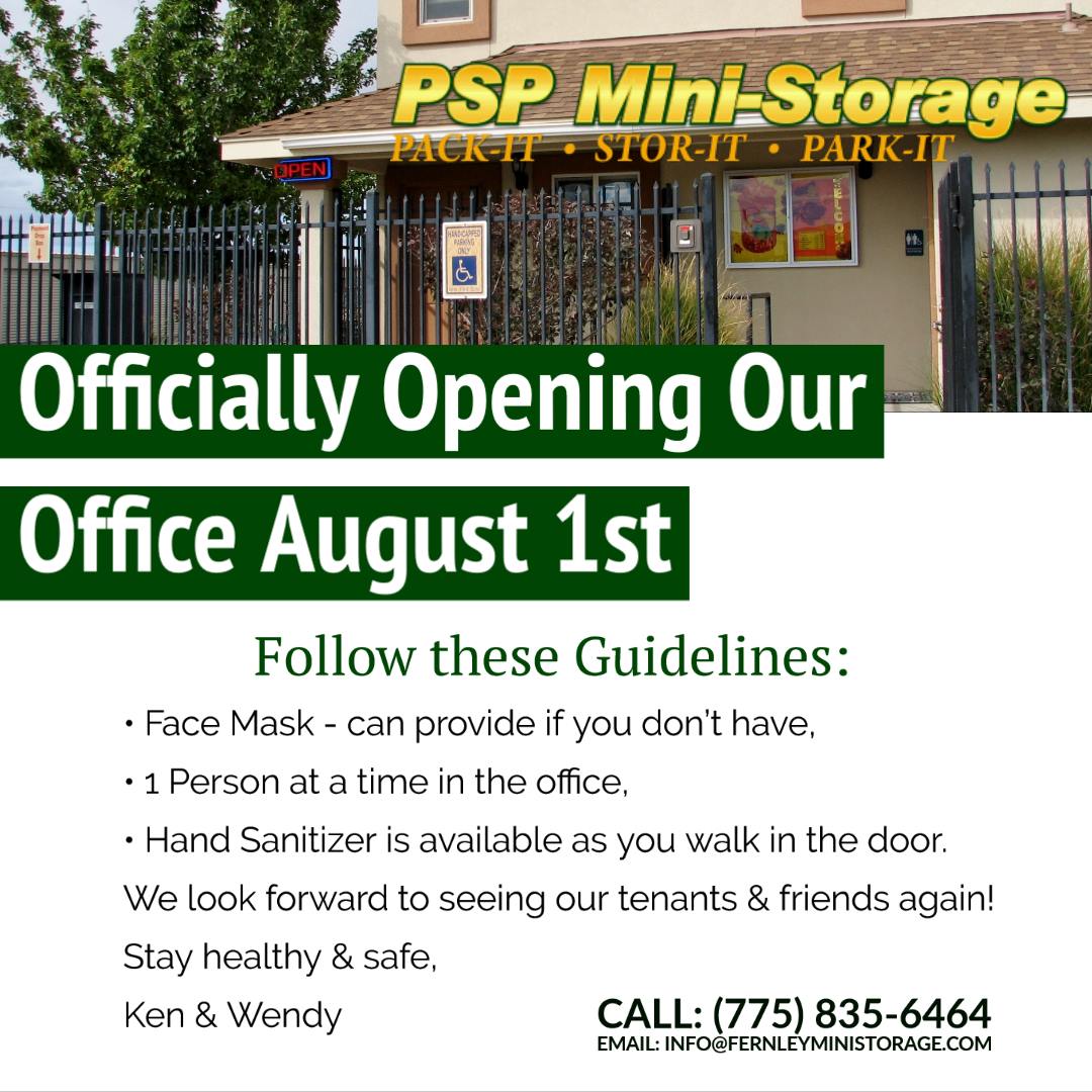 Our Resident Managers and qualified staff, at PSP Mini-Storage, in Fernley, Nevada are available to assist you with all of your self storage needs. Locally Owned and Operated, our tenants are more than unit numbers. Whether you are in transition or need a little extra room at home, we have your storage solutions. At Pack-It • Stor-It • Park-It, our goal is providing the best solution for your mini-storage needs. Each new tenant creates a unique passcode allowing entrance through our electronic controlled access gate. Every entry to your unit at the PSP Mini-Storage facility is recorded with a time-stamp. We also provide, free of charge, a new disc padlock for your unit.