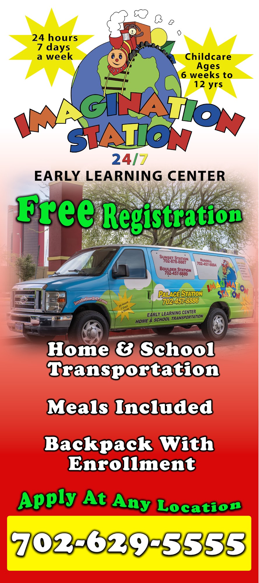 Whether they’re building friendships, diving into hands-on activities, or expressing themselves through art and storytelling, every moment at Imagination Station is crafted to inspire and support your little one’s journey. Come see the magic for yourself!! Schedule a free tour today and find out how we help young minds thrive—right here in the heart of Las Vegas. Facility offering daytime, overnight, weekend, and drop-in childcare for kids 6 weeks to 12 years old.
