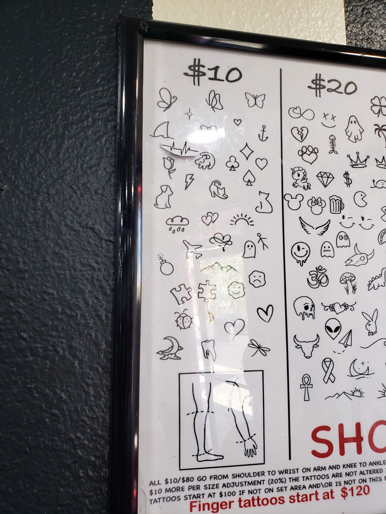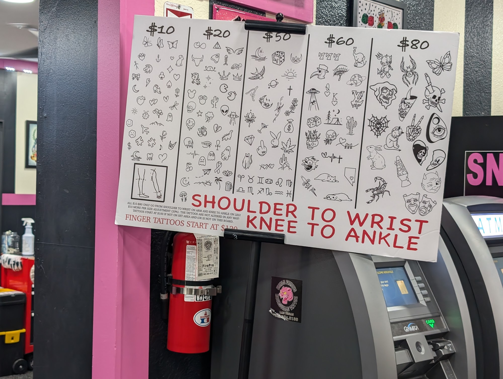 They have tattoos ranging from 10 to 100. Or more I am sure. Got a $50 tattoo. It's more for experience imo. They need better lighting for their gal tattooing in the corner. Overall good experience.