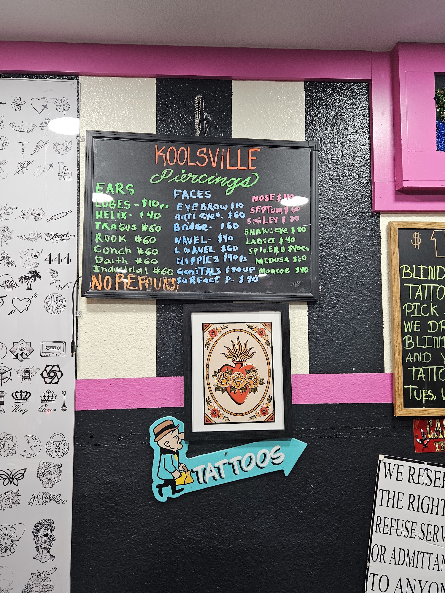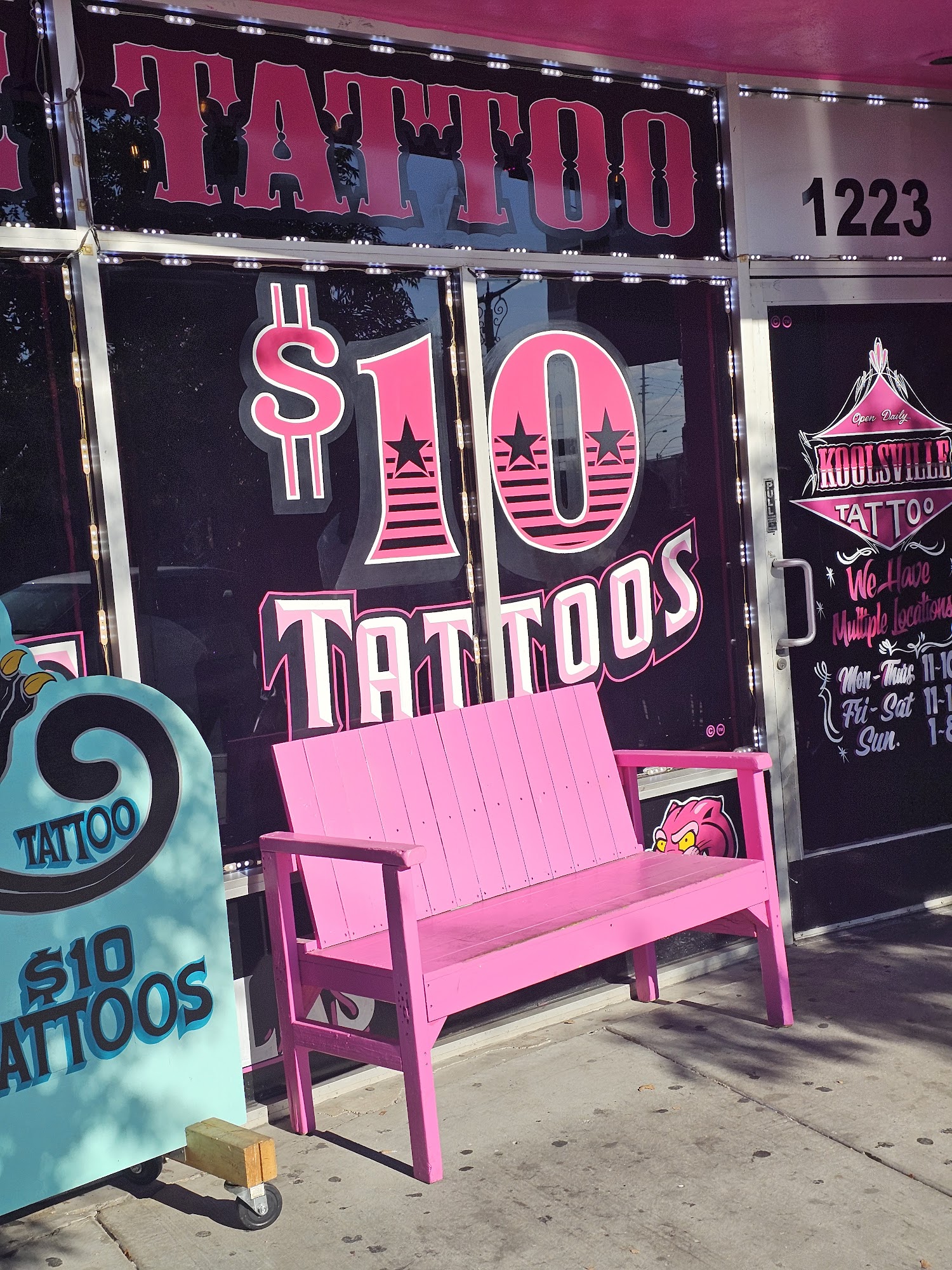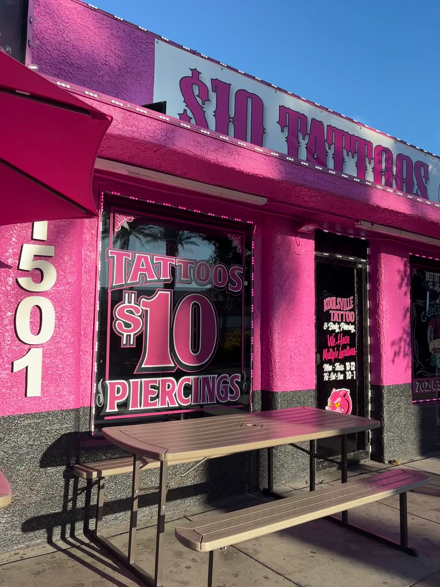 We have 7 great location in Las Vegas. So if you are a local or a tourist we are here to help. HOME OF THE $10 TATTOO AND PIERCINGS Koolsville Takes their last appointment 45 minutes before closing time. Under 18 requirements: Parent with matching government ID Birth Certificate Now let's get you started with the right tattoo to take back with you. Do you have preferred style, maybe a new school tattoo or realism tattoo. We have artist that are versatile in many styles. Our award winning tattoo artist are amazing to sit with and have the memento you have been thinking of on your skin. You cannot miss our pink buildings all along the Las Vegas strip. Please be patient with our wait times as Koolsville is in high demand.