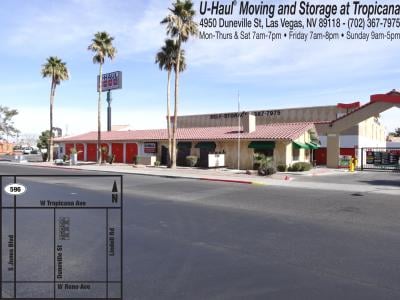 U-Haul Moving & Storage at Tropicana offers truck rentals, trailers, cargo vans, and self-storage for local or long-distance moves. The staff is consistently quick, friendly, very sweet, helpful, charismatic, and funny, providing amazing and professional customer service. Employees and management are described as understanding, perfect, amazing, professional, and informative. The location is noted for its prompt and professional services, with an accessible storage unit on location. It is considered convenient with a short commute. Customers report positive experiences with the helpful and willing staff over several years, highly recommending this location for moving and storage needs. The propane service is also praised for having a much lower price than pre-filled tanks.