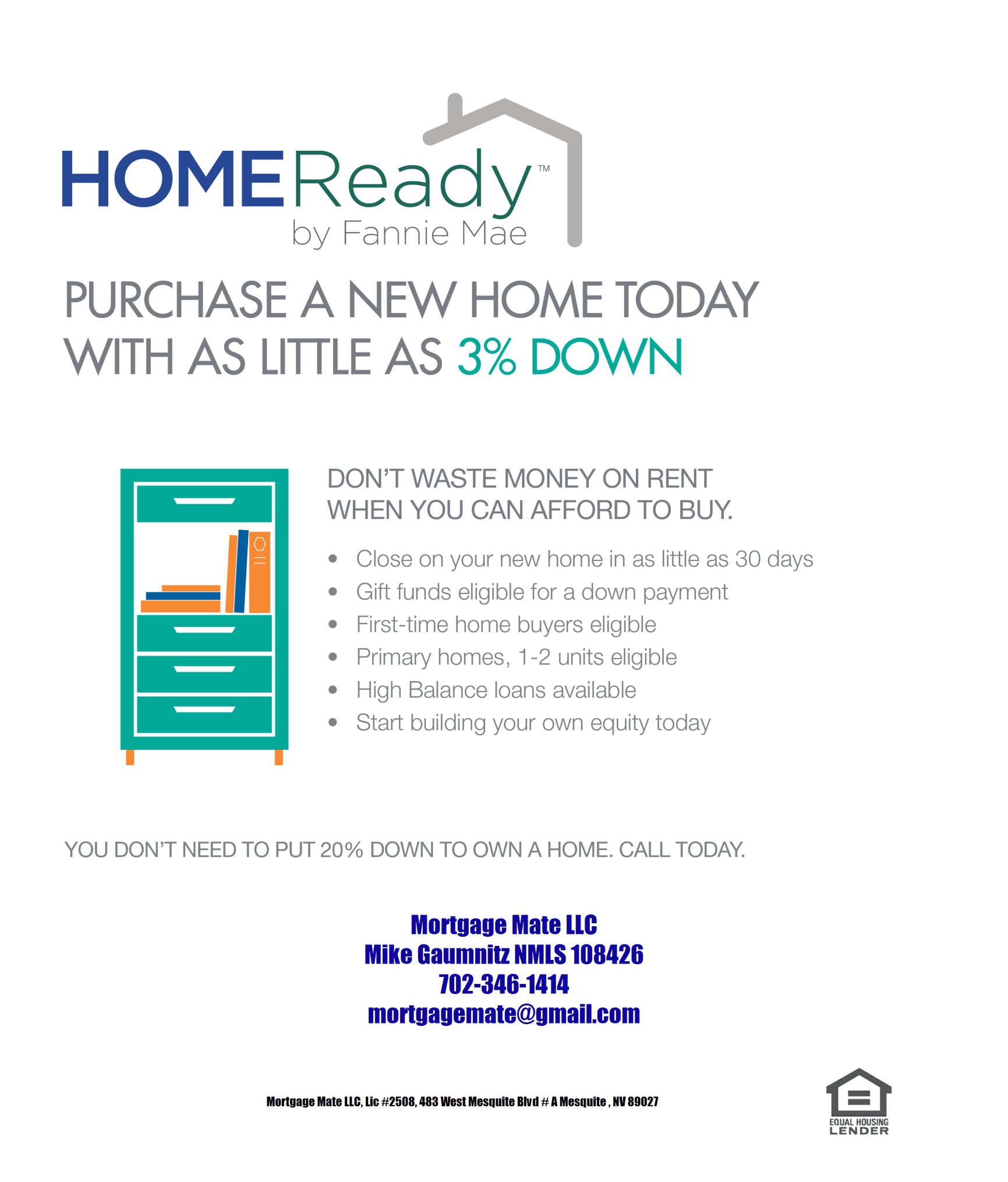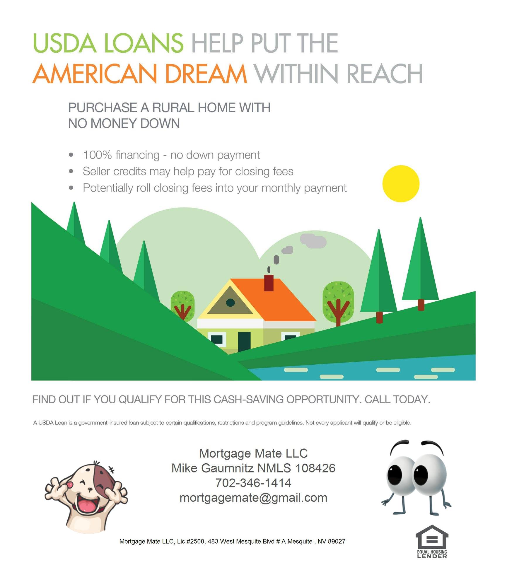 Mortgage Mate LLC in Mesquite, Nevada, is your trusted partner for all things mortgages and loans. Specializing in a seamless, supportive path to homeownership, we’re dedicated to turning your goals into realities. Our expertise caters to everyone, from first-time buyers to veteran investors. Our mission? To equip you with the financial tools for success. Your dream home and a prosperous financial future are just a call away. Call Mortgage Mate today!