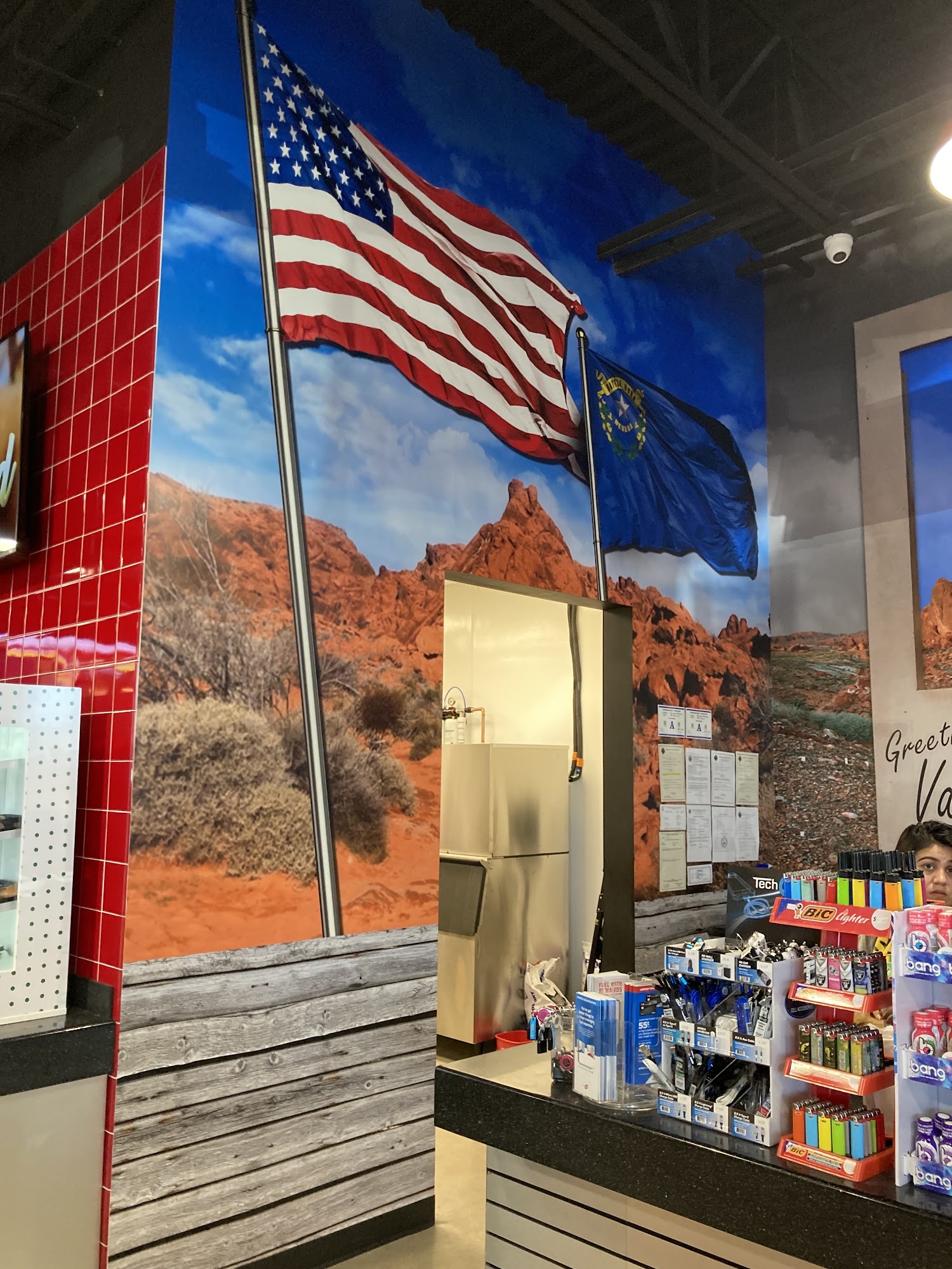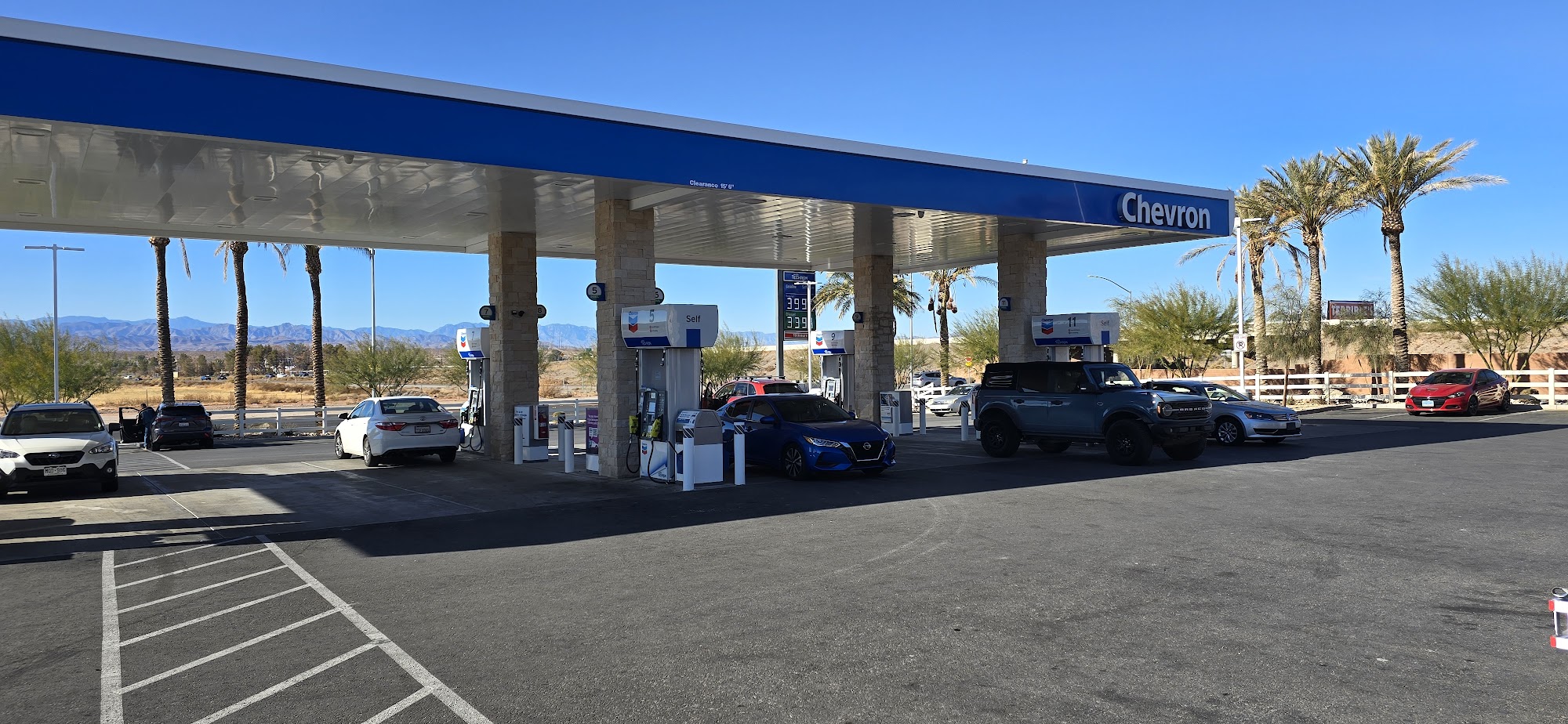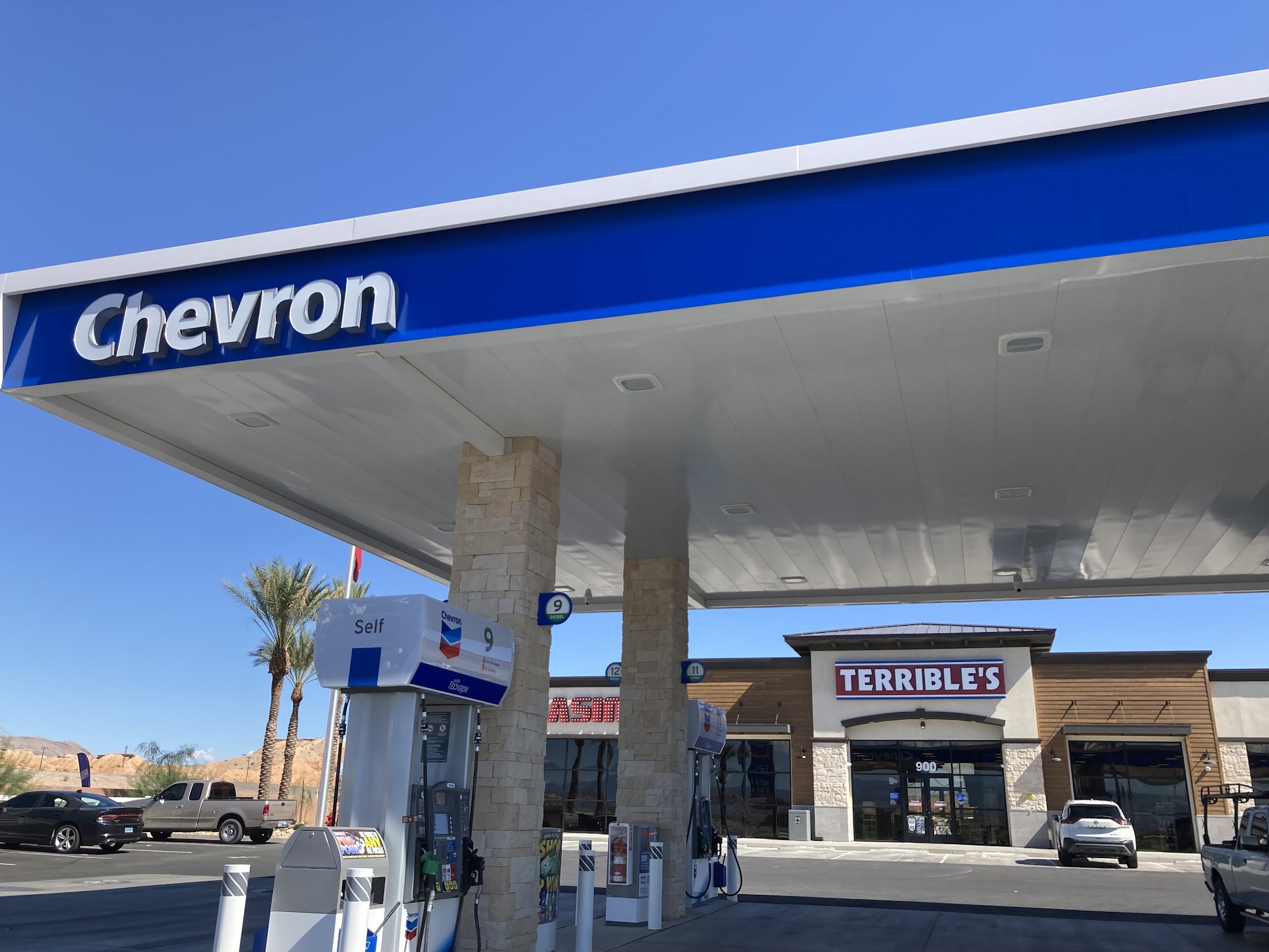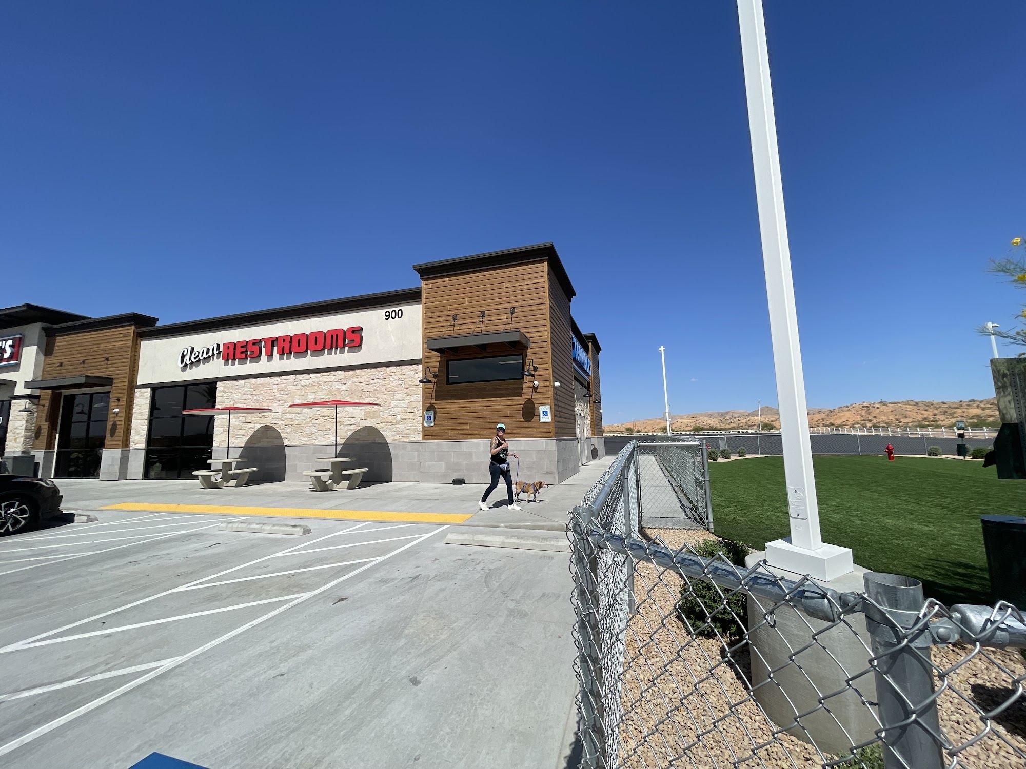 Chevron is a well-equipped and convenient gas station located just off the I15, open 24 hours. It offers more than just fuel, featuring a large artificial grass dog park with multiple dog bags and fully enclosed space, making it a great stop for travelers with pets. The station has a spacious truck parking area and outdoor covered picnic tables, ideal for stretching and relaxing. Inside, visitors can enjoy a clean, well-stocked convenience store with a wide variety of treats, drinks, and other items, including fresh Krispy Cream doughnuts. The restrooms are consistently clean and free to use. The staff is friendly and helpful, creating a welcoming atmosphere. Additional amenities include a small casino with slot machines, large traffic and weather information screens, and interesting decor inside, such as comic book heroine bathroom stall doors. While gas prices are higher, the overall setup and facilities make it a popular stop for drivers, travelers, and pet owners alike.