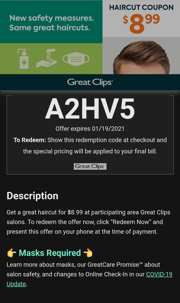 My husband and I really like this Great Clips! We’ve been going here since we moved to Reno a year ago. Unlike some stylists who have cut our hair in the past, they listen to us, and we are always happy when we leave!