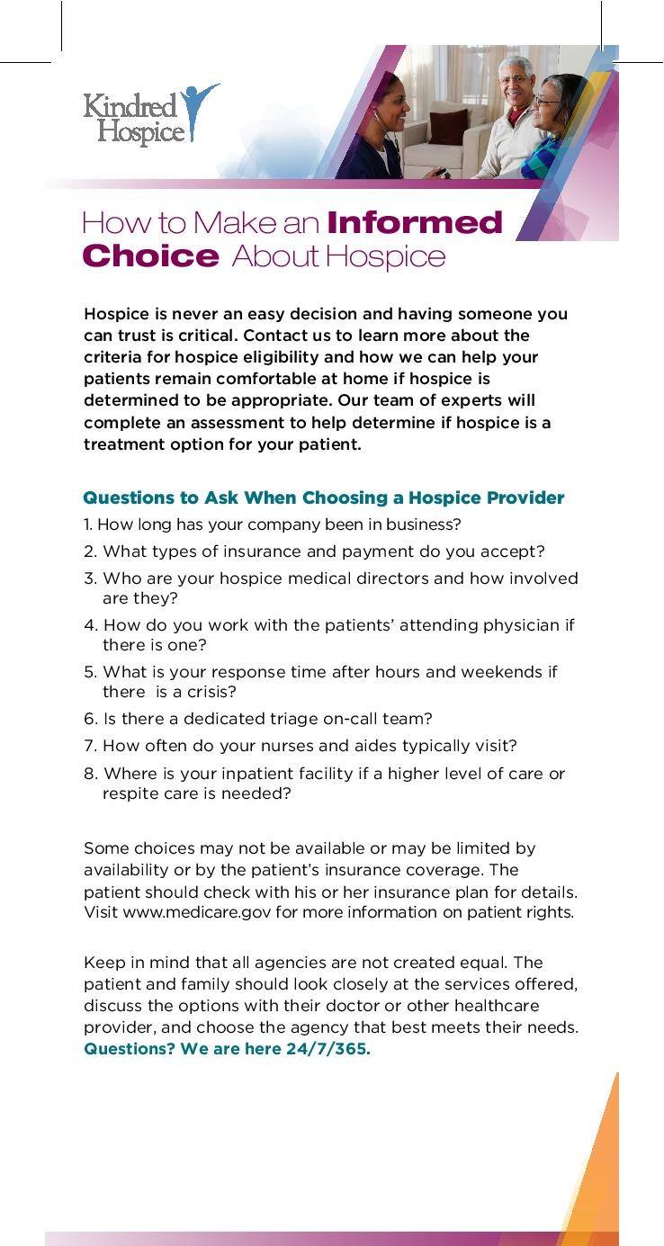 The nurses and employees at Kindred are kind, knowledgeable and helpful. I am so grateful for the nurse who visited and helped my father. I highly recommend Kindred to families whose loved one has months or weeks to live. Kindred helps families at every stage in the process.
