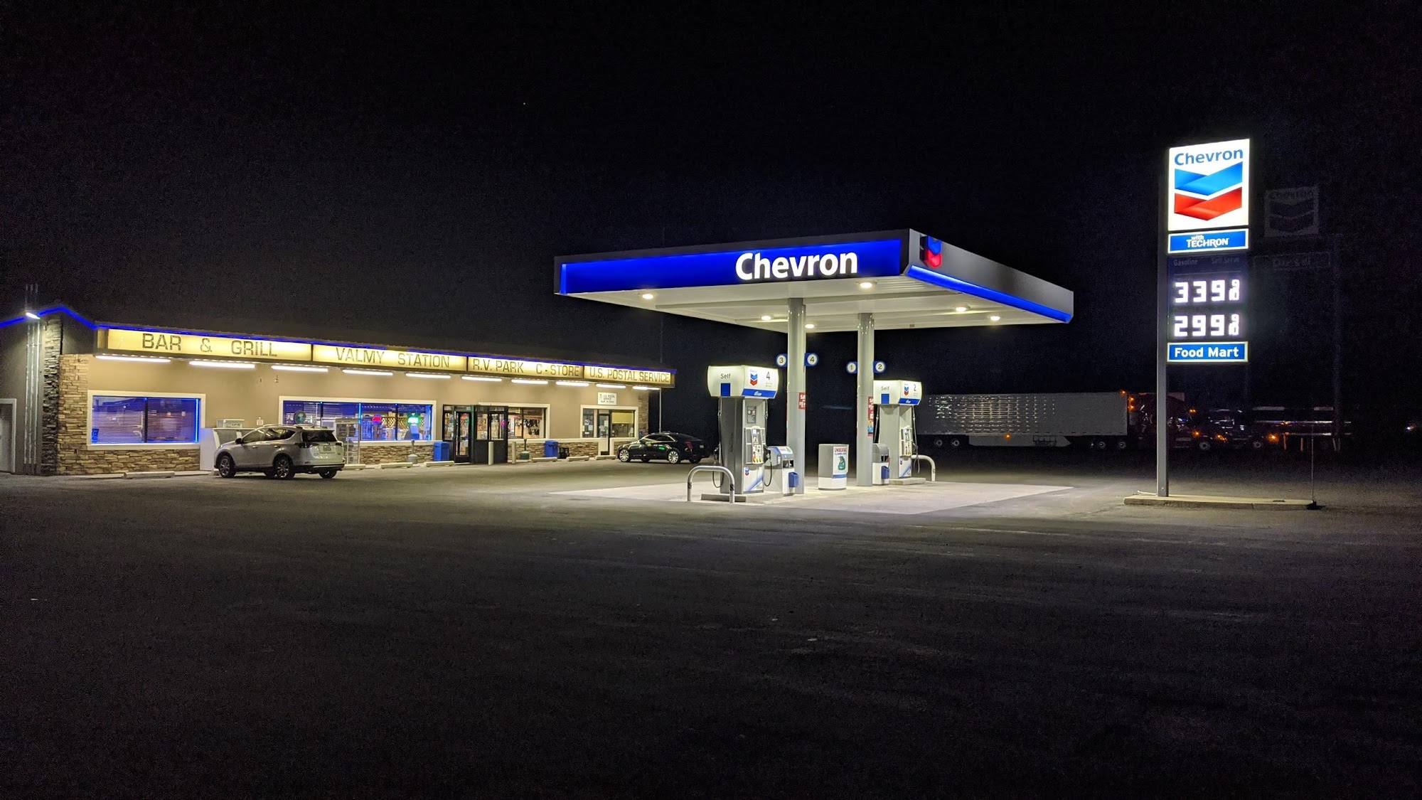 Valmy Chevron is a gas station and convenience store that offers a unique experience for travelers. The restrooms are reported to be very clean, although the gas pumps may need calibration. The atmosphere has a "From Dusk till Dawn" vibe, with a friendly staff that doesn't mind customers only purchasing the cheapest items. The menu features delicious and affordable options, including crazy good tater tots and burgers that are considered the best in the area. Overall, Valmy Chevron is a hidden gem that provides a satisfying and welcoming stop for those passing through.