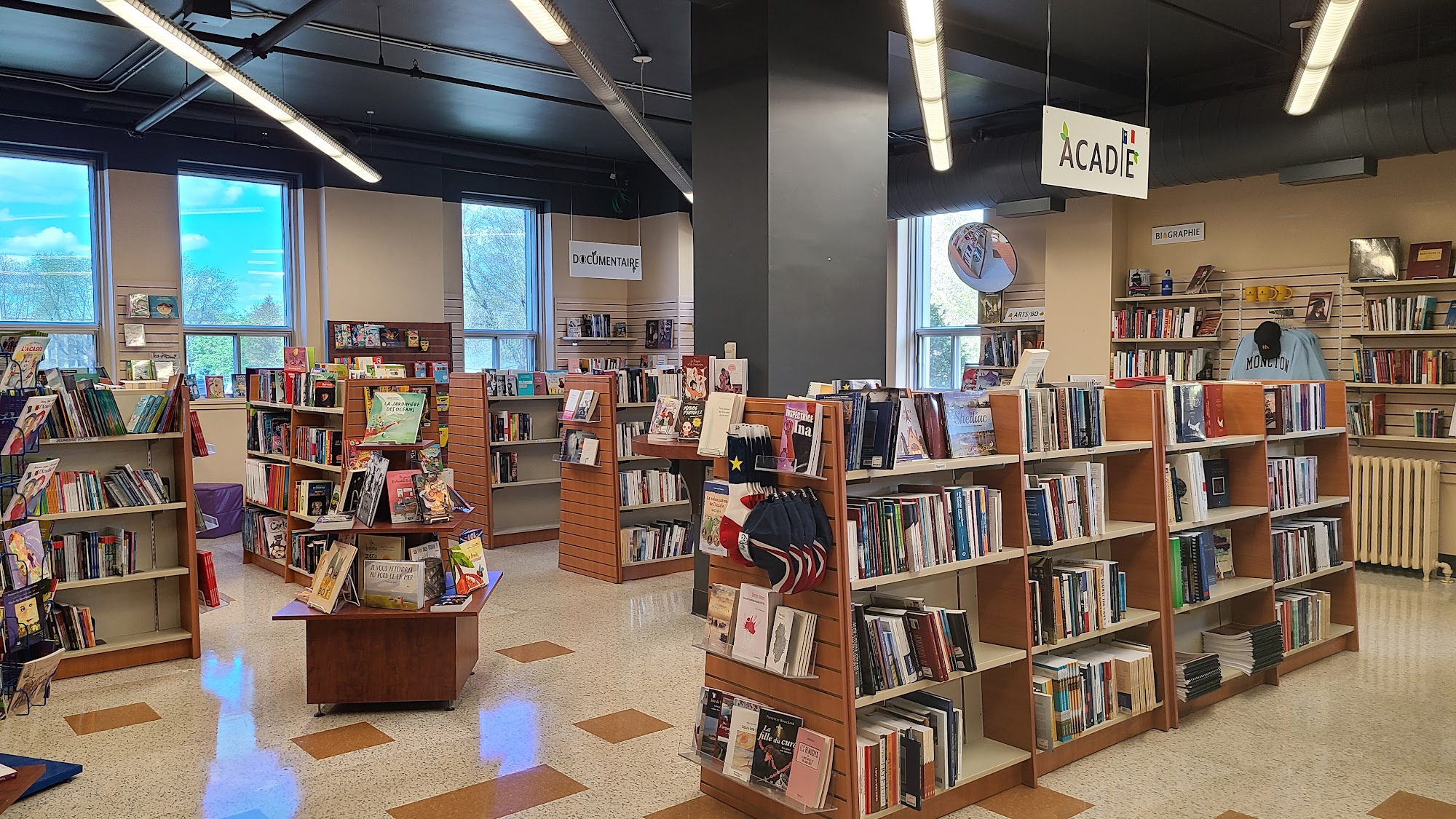 La Librairie acadienne contient au dessus de 13 000 titres francophones et acadiens dans le Grand Moncton. Cette sélection est unique au Canada Atlantique et permet aux gens des diverses communautés francophones et acadiennes du monde de connaître l'Acadie et la francophonie.