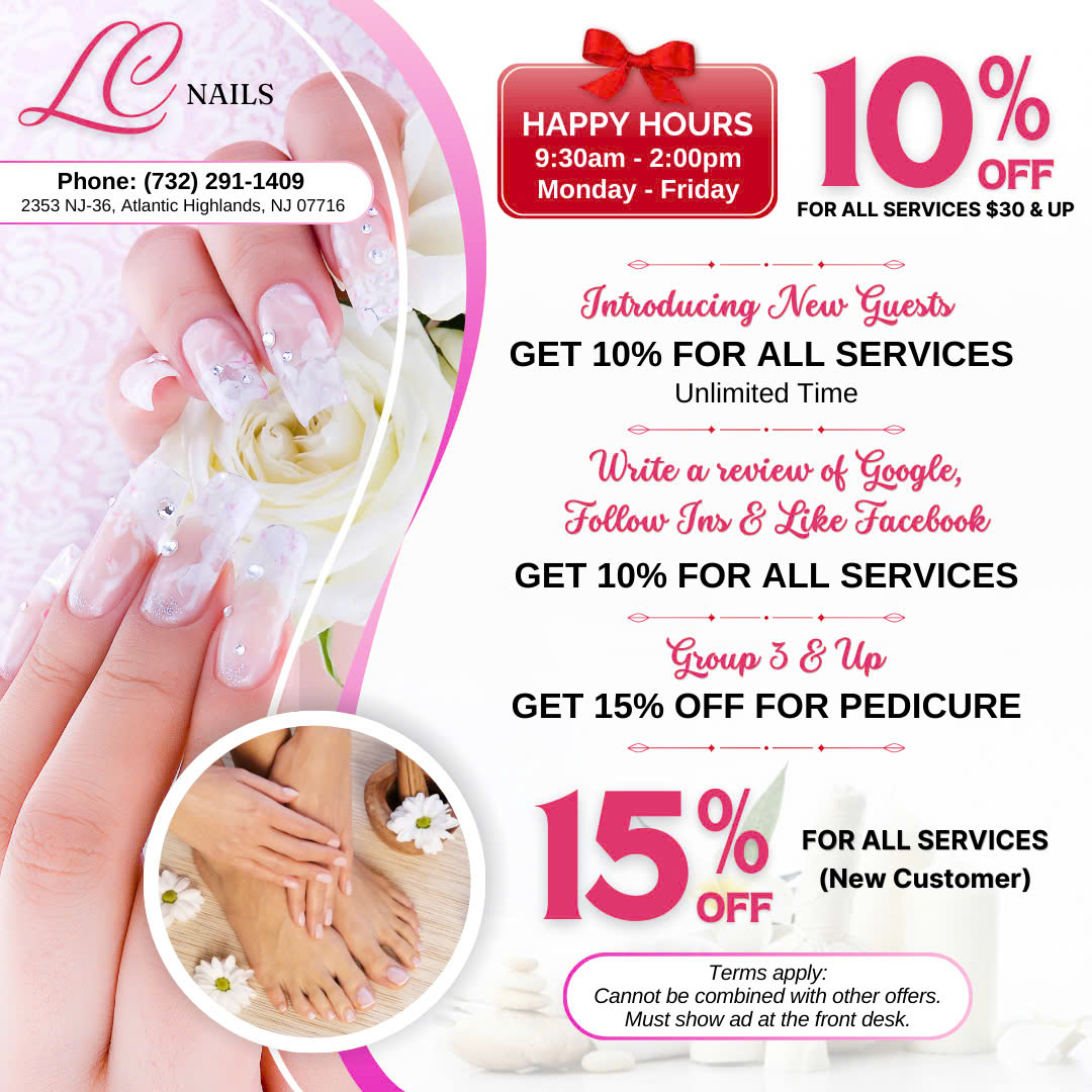LC Nails, located in a beautiful corner of Atlantic Highlands, New Jersey, is a popular salon dedicated to delivering the highest level of customer satisfaction. The salon offers a range of services, including waxing, nail services, and manicures and pedicures, making it a one-stop destination for a complete rejuvenating experience. The friendly staff creates a clean and relaxing atmosphere, and the nail technicians are known for their talent and gentleness. Many customers have been impressed with the amazing service and stunning results, often mentioning that their nails look flawless and feel strong. The techs are recognized for their speed and thoroughness, ensuring customers receive quick and efficient service. With very little staff turnover, many have enjoyed consistent experiences over the years. Overall, LC Nails is a great choice for those looking for an exceptional nail salon experience and is highly recommended by satisfied customers.