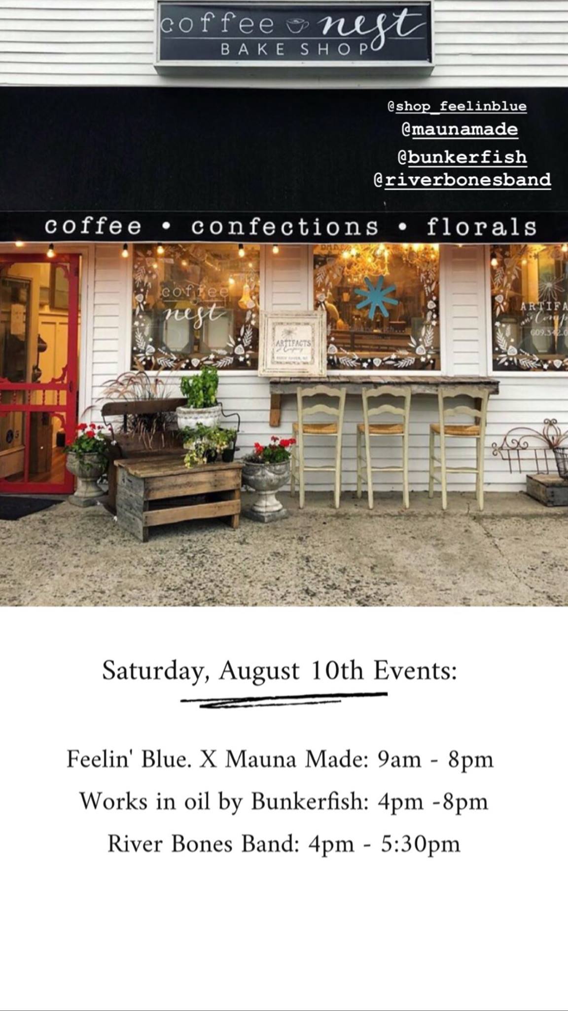 Artifacts New Flower Nest Market elevates floral artistry for every occasion - wedding flowers, event design and arrangements, elegant home décor or just a wonderful hostess thank you! We want to be your go-to place to pick up the freshest flowers on Long Beach Island. We are happy to deliver unique arrangements or cut floral bouquets locally. In addition to floral designs, we are also offering styling, display rentals and design services to truly complete the look you're going for on that special day. Let us make your beach house or your beautiful upcoming event bloom!weddings & events My Daughters Grace Coffee Nest is a Cozy on of a Kind Artisan Coffee and Baked goods shop that shares ourSpace in Artifacts New Shop ..And we deliver.