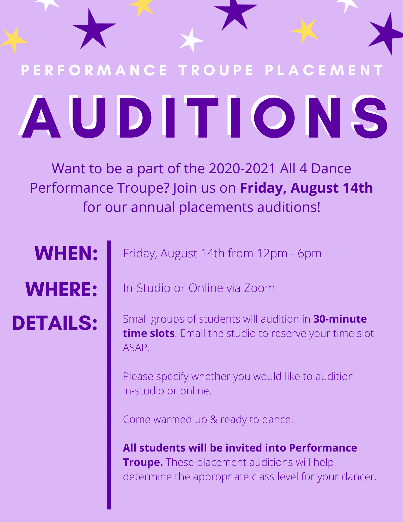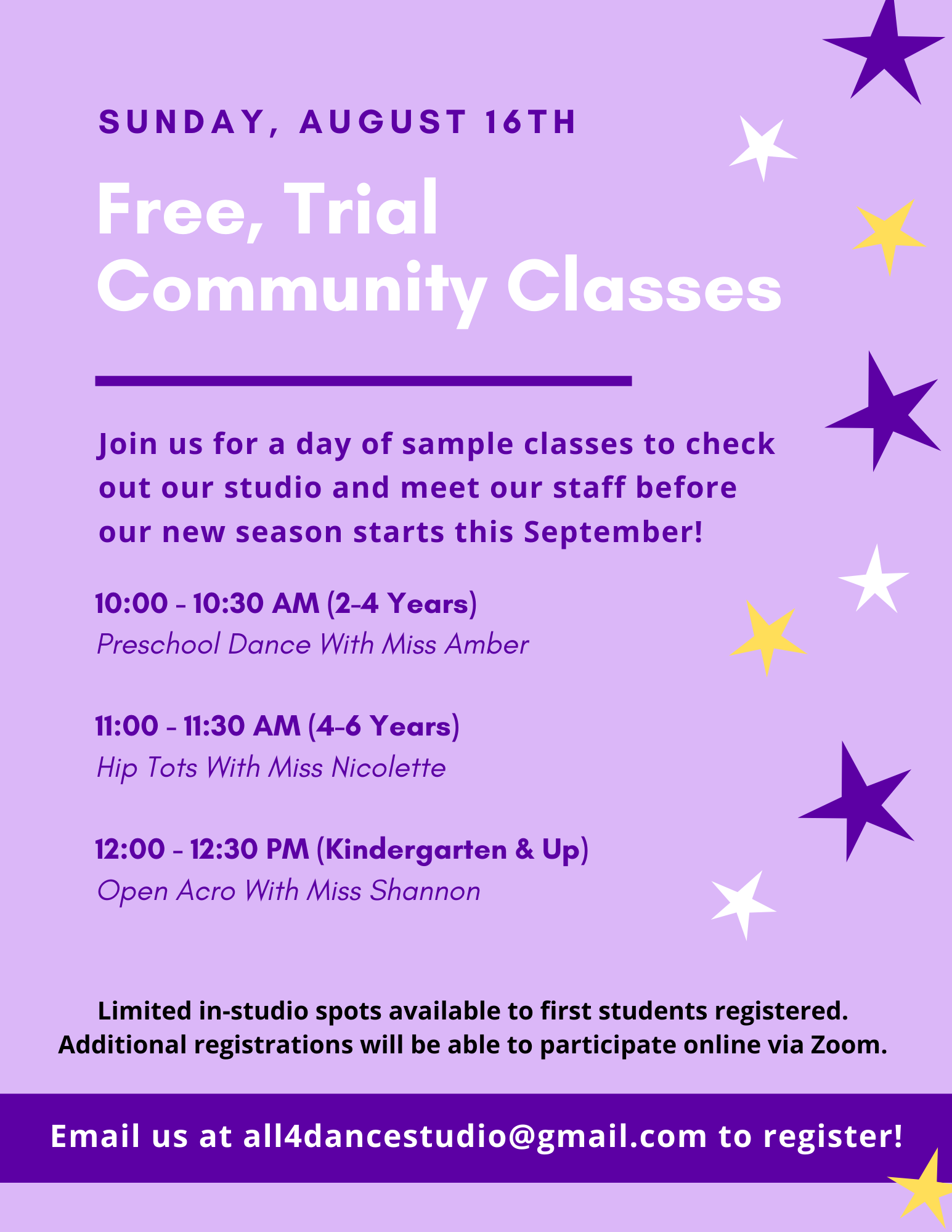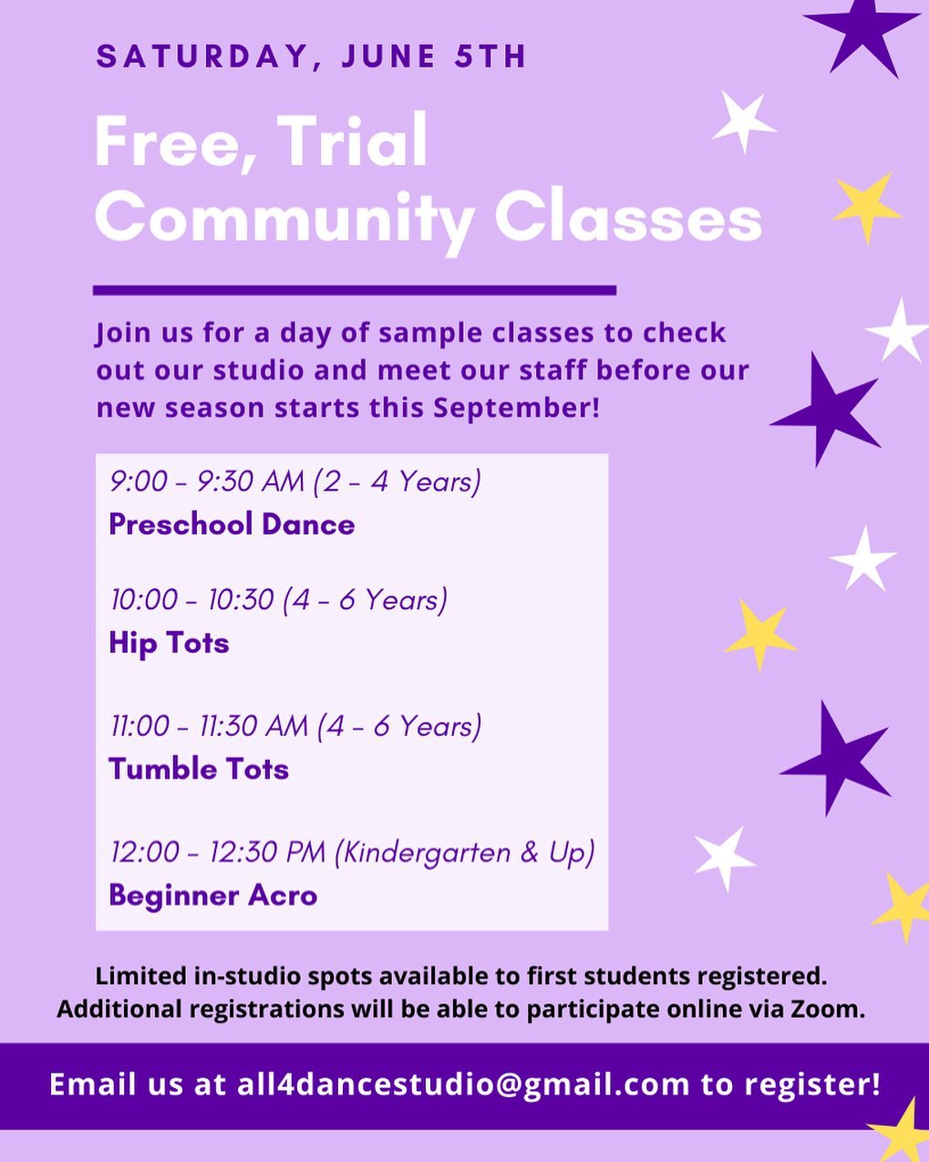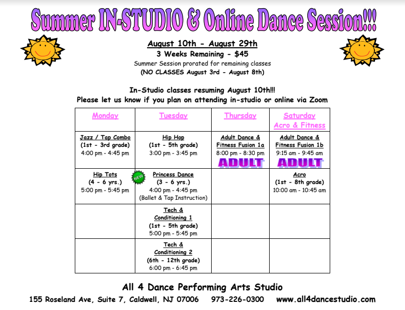 My daughter has been at All 4 Dance since age 2. We are in our 6th year. Megan runs a great program with the best teachers. All 4 Dance is such a warm environment where children have fun and learn too! A family feel is definitely created!!! I can’t say enough positive things about this studio!!!