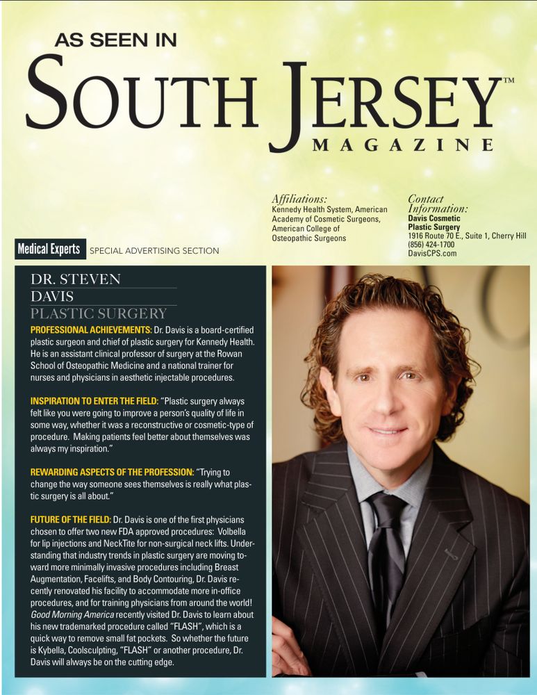 Dr. Davis specializes in Cosmetic Plastic Surgery including Breast Augmentation, Liposuction & Body Contouring, Facelift, Necklift, Eyelid Lift, & Rhinoplasty. He also a national physician trainer teaching all non-surgical techniques such as Botox, facial fillers, lasers, and many other products. He is Chief of Plastic at Kennedy Hospital of Cherry Hill and the Medical Director of the Laser Skin Spa at Davis Cosmetic Plastic Surgery.