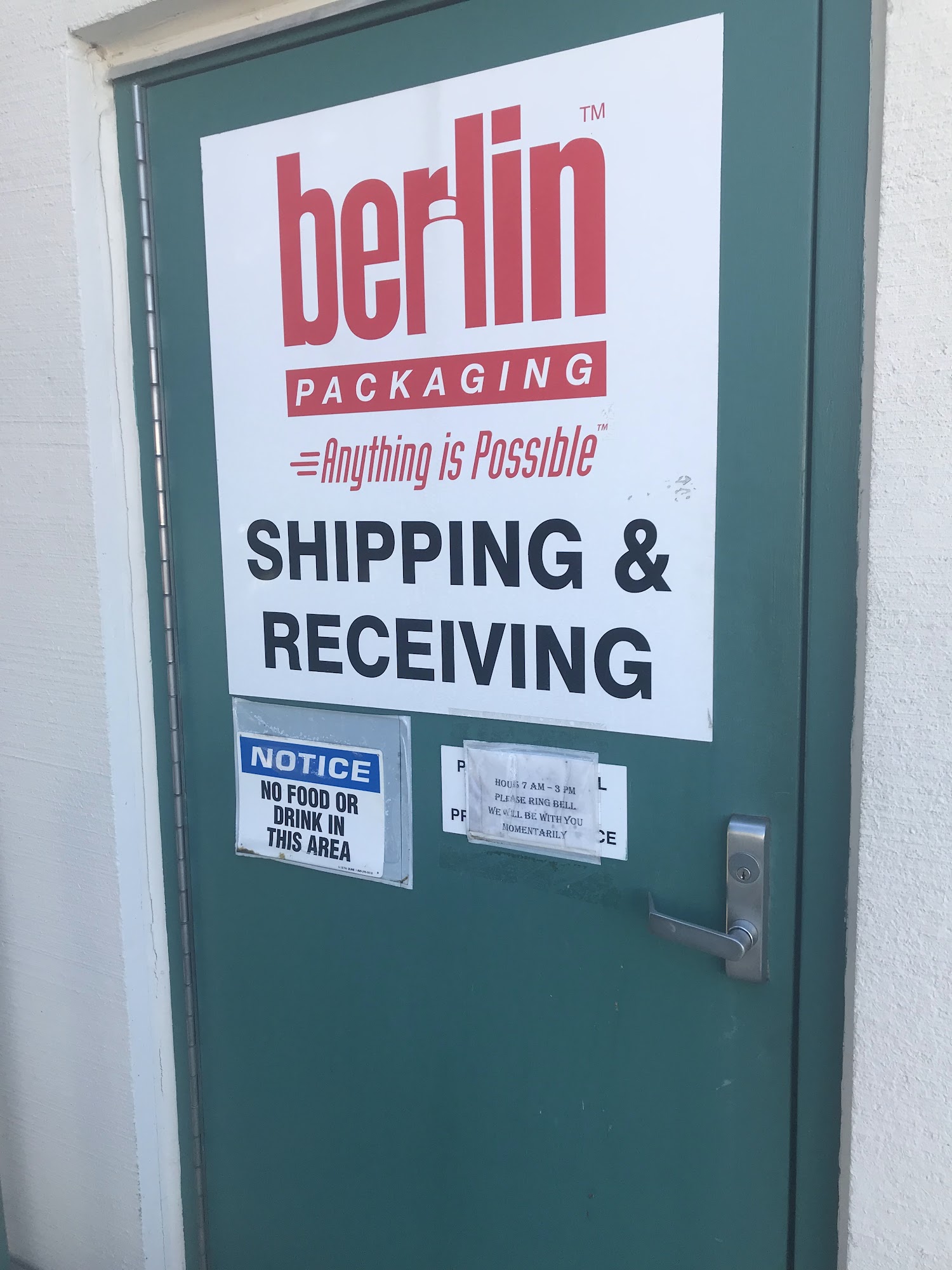 Berlin Packaging is open by appointment from 7:00 am. The operators are patient, helpful, and confirm details. They work very quickly and are very understanding. Deliveries arrive in perfect condition, with items double boxed. GPS routing to the complex can be difficult, but there is plenty of room. Overnight parking is available. They are very busy, so calling can be challenging. The service is highly recommended for great jobs.