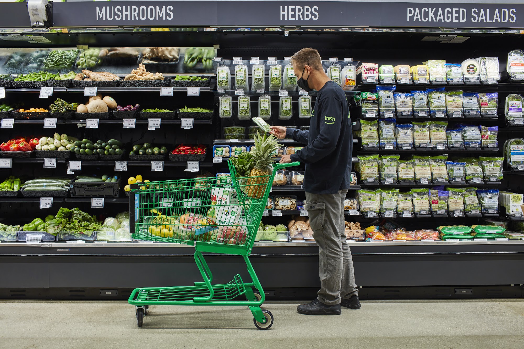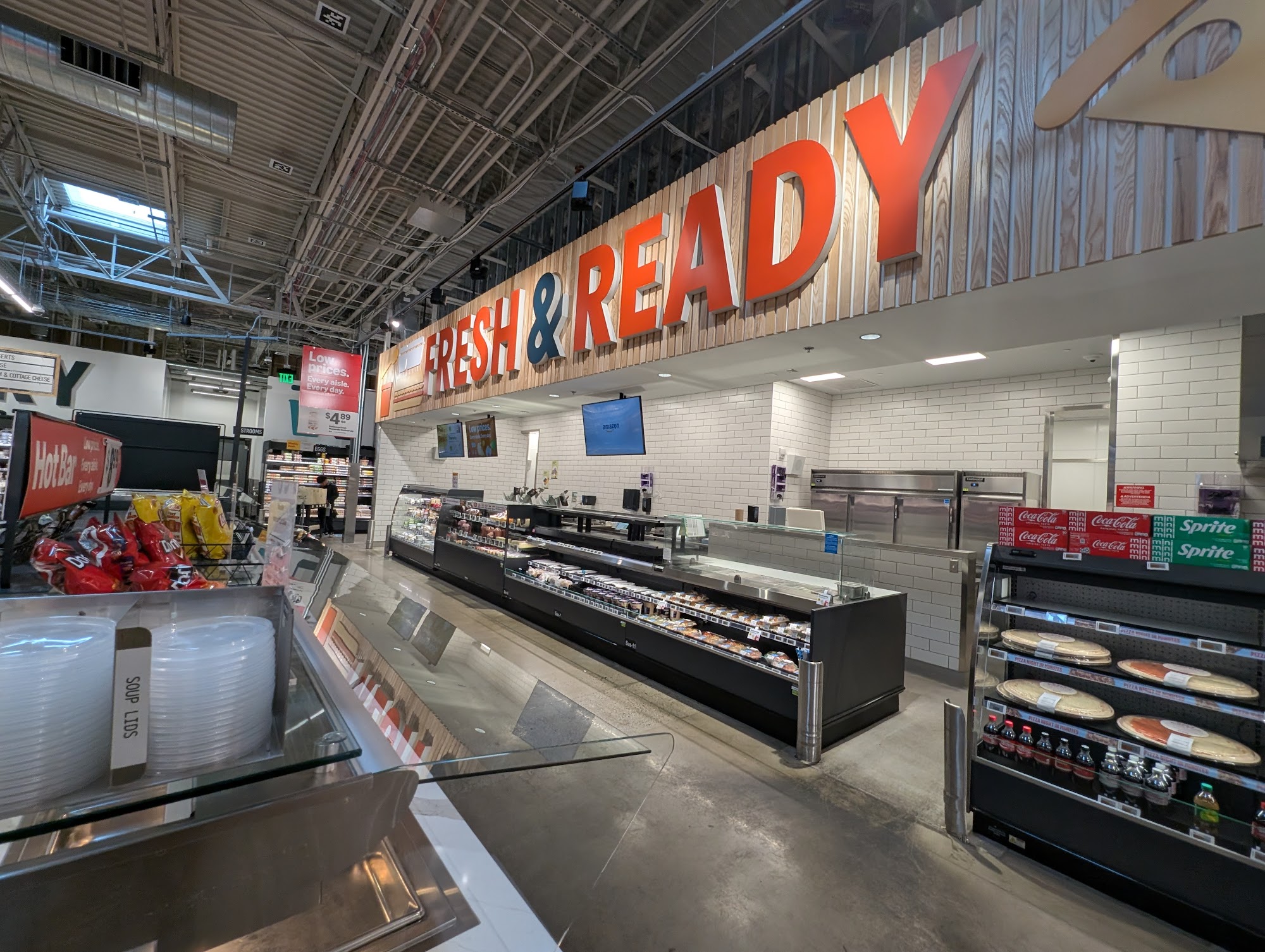 Amazon Fresh is a small store that is clean and organized. All produce is picture perfect and the prepared foods and salad bar look so delicious. Hot bar food items such as orange chicken and chicken tenders are popular. Prices are a little higher than many grocery stores, but the store is not so busy and workers are friendly and helpful. The dash cart scans items and a special lane lets customers pay with a credit card on their Amazon account. Weekly deals and specials help even out higher prices. Fresh produce prices are great and workers are very helpful. The store is well stocked and always has Vital Farm Eggs. Prices have lowered, making the store a semi‑regular stop for basics. Some employee shoppers can be annoying and may not show courtesy. Produce is good and competitively priced, as are Amazon‑branded dairy items, canned and dry goods. Serviceable and worth a visit now and then, even if it can be very difficult to find anything. Amazon elfs are in the way. Amazon Prime shoppers must use the cart, which makes checkout a breeze. Rotisserie chickens are the same as Whole Foods but a few dollars cheaper. A free fruit tower is available for kids. Selection can be limited and home delivery is not reliable; orders arrive late or not at all and there is no way to call the store directly. The store does not accept Apple Pay; a physical card or the app is required.